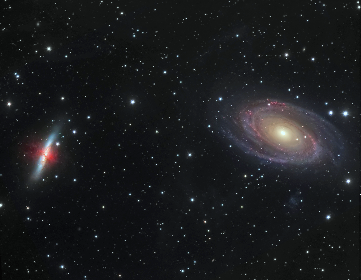 A la derecha, rodeada por brazos espirales azules, se encuentra la galaxia espiral M81. A la izquierda, marcada por nubes de gas y polvo rojizas, se encuentra la galaxia irregular M82. Esta asombrosa vista muestra a estas dos gigantescas galaxias en una lucha gravitacional, como han estado durante los últimos mil millones de años. La gravedad de cada galaxia afecta dramáticamente a la otra durante cada paso que dura cien millones de años. En la última interacción, la gravedad de M82 probablemente generó ondas de densidad que se propagaron alrededor de M81, resultando en la riqueza de los brazos espirales de M81. Pero M81 dejó a M82 con regiones de formación estelar violenta y nubes de gas colisionando con tanta energía que la galaxia emite radiación en rayos X. En unos pocos miles de millones de años, solo quedará una galaxia.