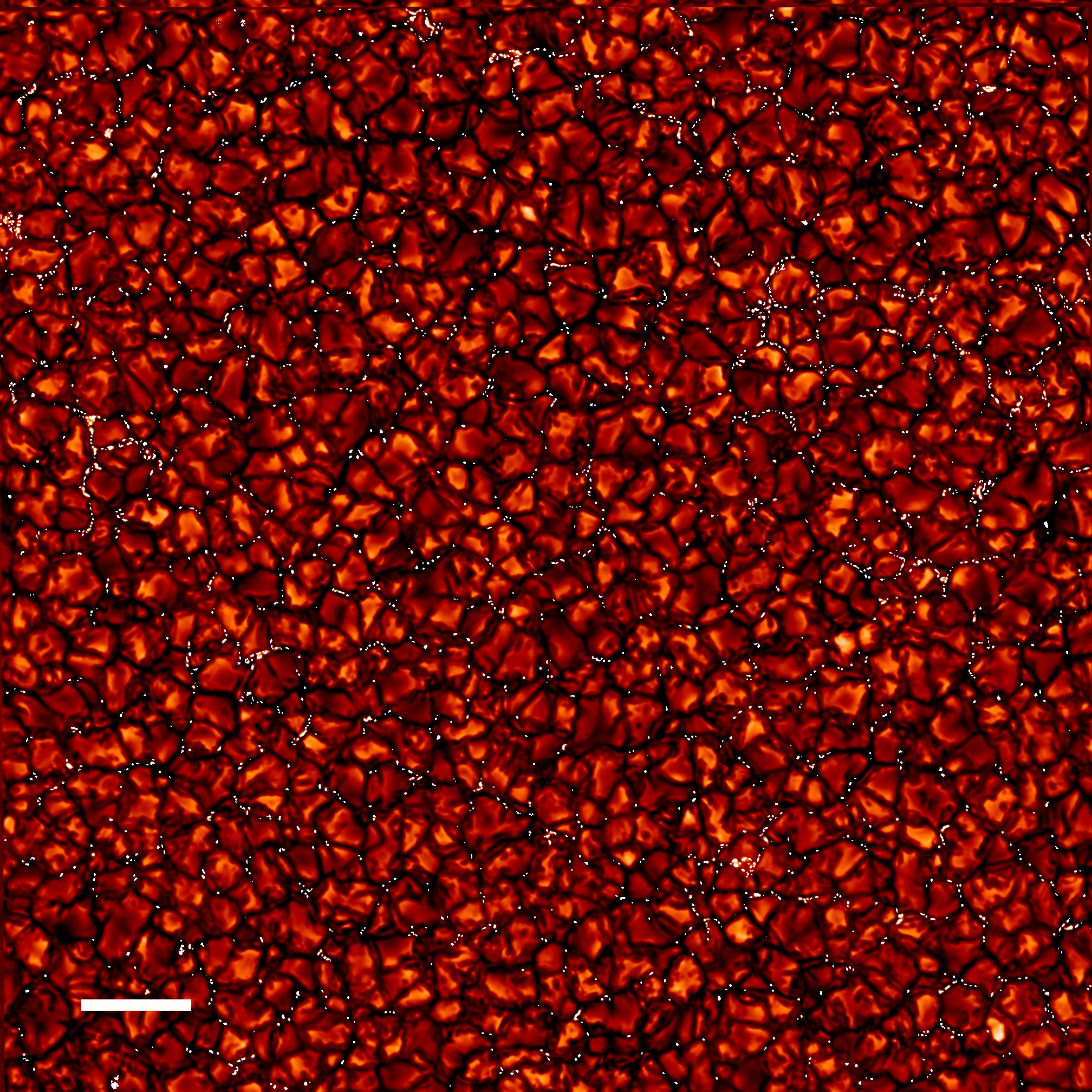 De cerca, la superficie solar es una sorprendente malla de granulos en esta imagen de alta resolución del Sol tranquilo. Causados por la convección, los granulos son columnas calientes de plasma ascendente bordeados por surcos oscuros de plasma más frío descendente. Pero la vista de alta resolución revela que los surcos oscuros están salpicados de muchos pequeños puntos brillantes, contrastantes. Presentes constantemente en la superficie solar, los puntos brillantes no parecen estar relacionados con las manchas solares que aparecen y desaparecen con el ciclo magnético solar. Sin embargo, los puntos brillantes son regiones de campos magnéticos concentrados y son brillantes porque la presión magnética abre una ventana hacia capas más profundas y más calientes debajo de la fotosfera. Para escalar, la barra blanca en la esquina inferior izquierda corresponde a 5000 kilómetros a través de la superficie solar. La imagen nítida y de banda estrecha fue registrada en septiembre de 2007 utilizando el Telescopio Solar Sueco en la isla astronómica de La Palma.