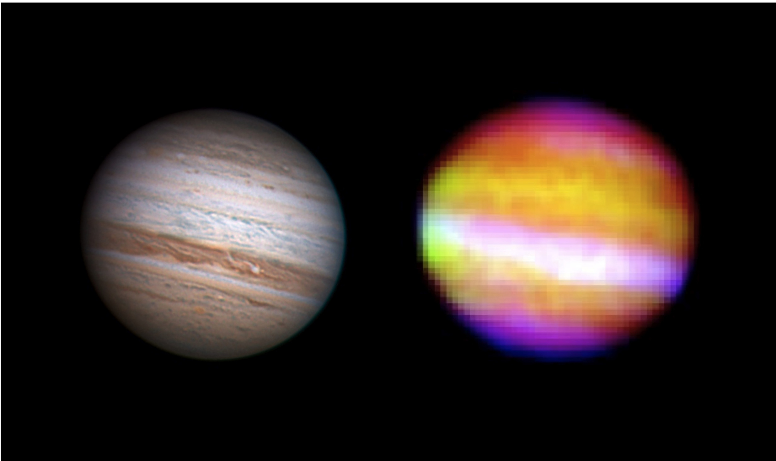SOFIA, la Observatorio Estratosférico para Astronomía en el Infrarrojo, capturó sus imágenes de 'primera luz' el 26 de mayo, desde una altitud de 35 000 pies. Mientras volaba por encima de la mayor parte del vapor de agua de la Tierra que absorbe la luz infrarroja, las primeras imágenes infrarrojas de SOFIA del cosmos incluyeron esta notable imagen en falso color (panel derecho) de Júpiter. Para comparación, a la izquierda se muestra una reciente imagen de luz visible obtenida desde tierra. Ambas muestran al gigante gaseoso que domina nuestro sistema solar sin su cinturón ecuatorial sur oscuro (normalmente visible en el hemisferio superior en esta orientación). Esa característica familiar desapareció a principios de mayo. Pero la banda brillante y blanca en la imagen de SOFIA es una región de las nubes de Júpiter transparente a la luz infrarroja, ofreciendo una mirada debajo de las nubes.