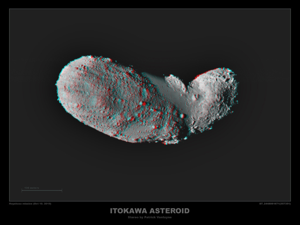 Get out your red/blue glasses and float next to asteroid Itokawa, a diminutive world of the solar system only half a kilometer across. Boulders strewn across its rough surface and the lack of craters indicate that this asteroid is a rubble pile, formed as smaller pieces collected and were kept together by gravity. The stereo view was constructed from images made by the Hayabusa spacecraft when it encountered the asteroid in 2005. After a long journey, the spacecraft re-entered the atmosphere on June 13 over Australia, successfully parachuting a capsule to Earth. Hayabusa's capsule could contain a small sample of material from rubble pile asteroid Itokawa. Ponder: Can you guess the result to this simple experiment?