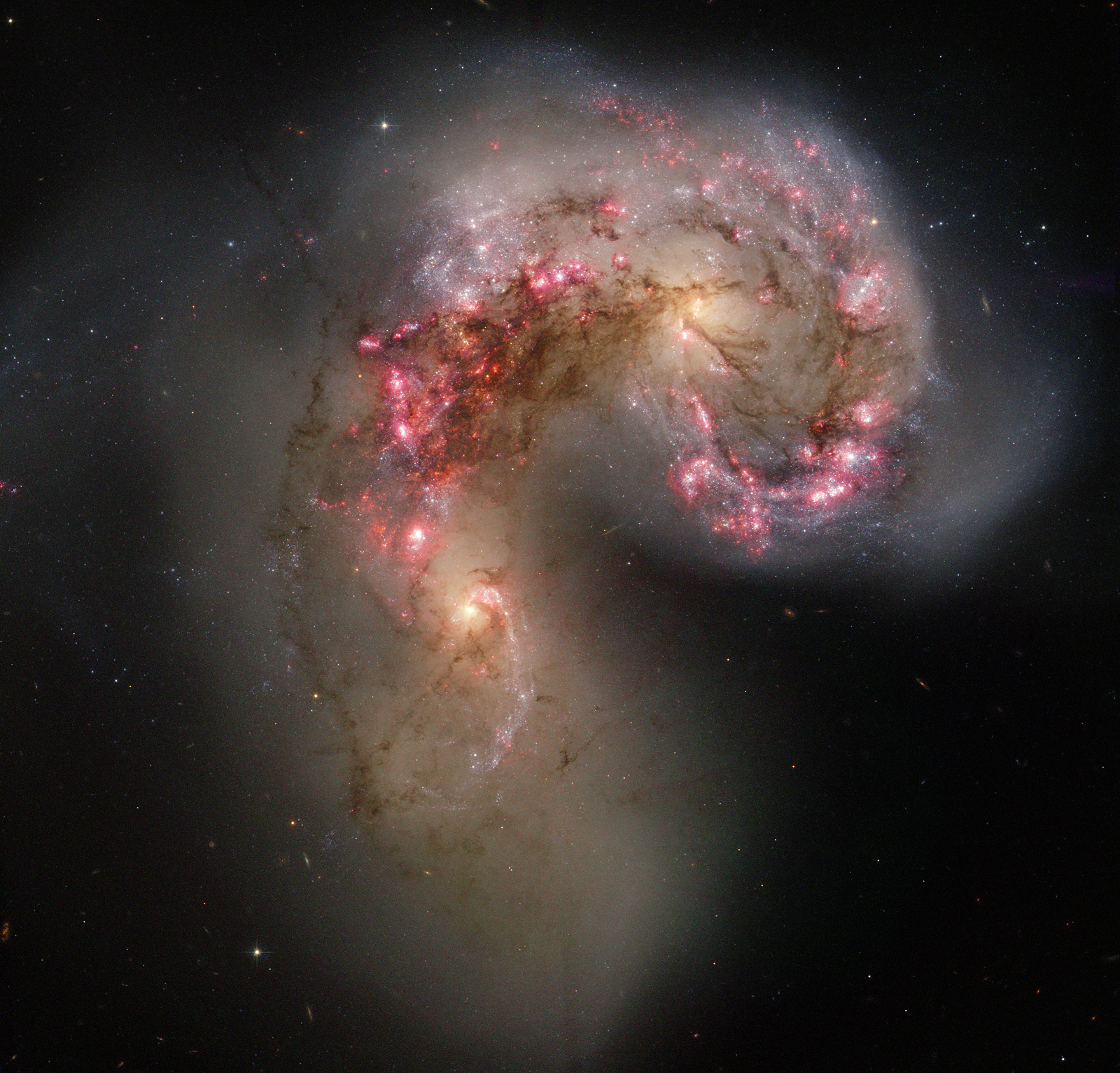Two galaxies are squaring off in Corvus and here are the latest pictures. But when two galaxies collide, the stars that compose them usually do not. That's because galaxies are mostly empty space and, however bright, stars only take up only a small amount of that space. During the slow, hundred million year collision, one galaxy can still rip the other apart gravitationally, and dust and gas common to both galaxies does collide. In this clash of the titans, dark dust pillars mark massive molecular clouds are being compressed during the galactic encounter, causing the rapid birth of millions of stars, some of which are gravitationally bound together in massive star clusters.