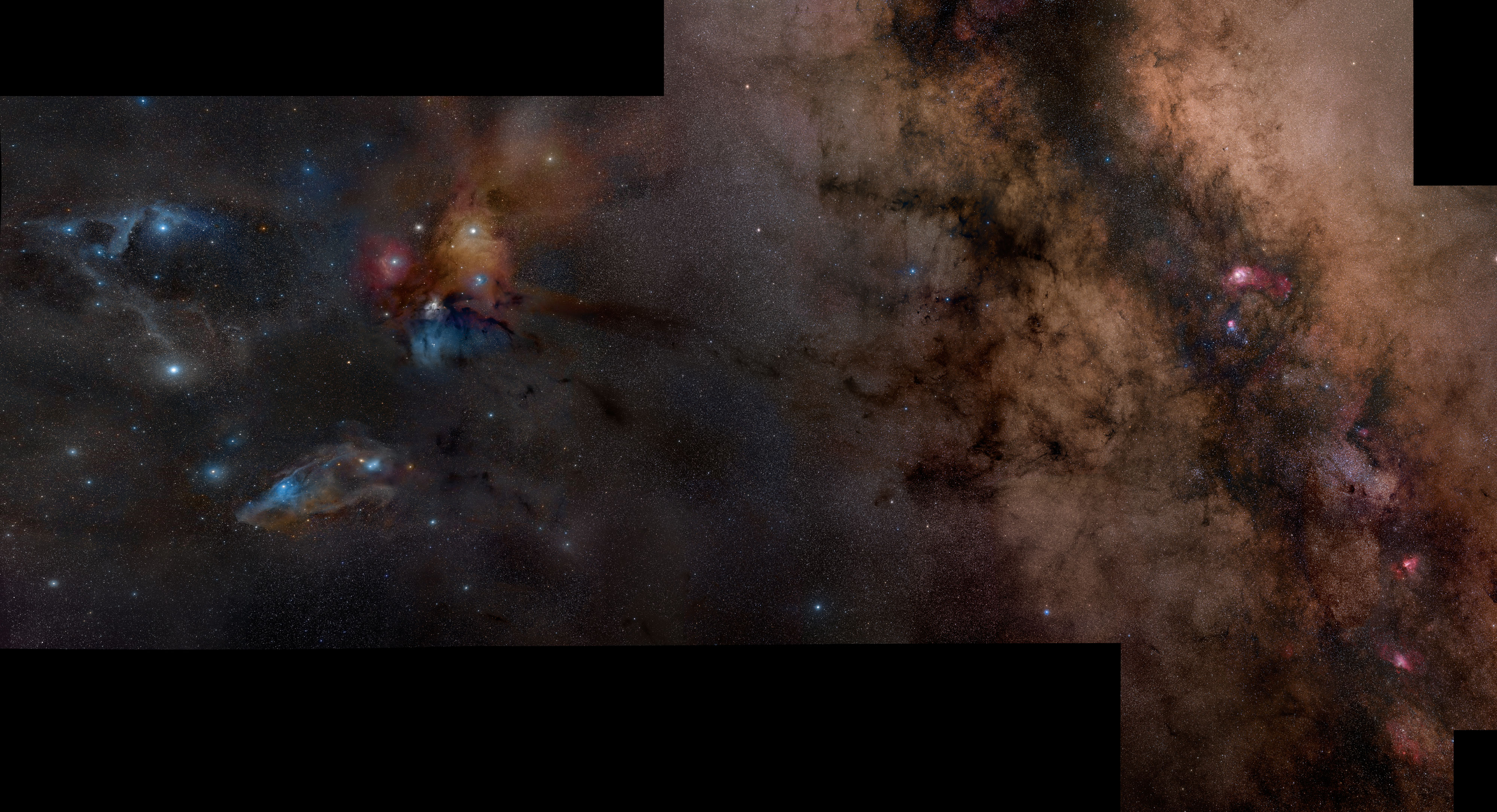 Un río oscuro de polvo parece extenderse desde el centro de nuestra galaxia, y luego acumularse en un campo estelar que contiene maravillas celestes fotogénicas. Al desplazarse hacia la derecha se revelarán muchos de estos objetos, incluyendo (¿puedes encontrarlos?) la estrella naranja brillante Antares, una nebulosa caballito de burro de color azul (de ojos azules), el cúmulo globular blanco M4, el sistema estelar azul brillante Rho Ophiuchi, la nebulosa Pipe de color marrón oscuro, la nebulosa Lago roja, la nebulosa Trífida roja y azul, la nebulosa Pata de Gato roja, y el centro multicolor pero aún importante de nuestra galaxia. Esta amplia vista captura con un detalle exquisito aproximadamente 50 grados del cielo nocturno, 100 veces el tamaño de la luna llena, cubriendo constelaciones desde el Arquero (Sagitario) hasta el Portador de la Serpiente (Ofiuco), hasta el Escorpión (Escorpión). El propio río oscuro puede identificarse como la banda de polvo marrón conectada a Antares, y abarca aproximadamente 100 años luz. Dado que la banda de polvo del río oscuro se encuentra a solo unos 500 años luz de distancia, solo aparece como un puente hacia el centro galáctico mucho más distante, que en realidad se encuentra a unos 25 000 años luz de distancia.
