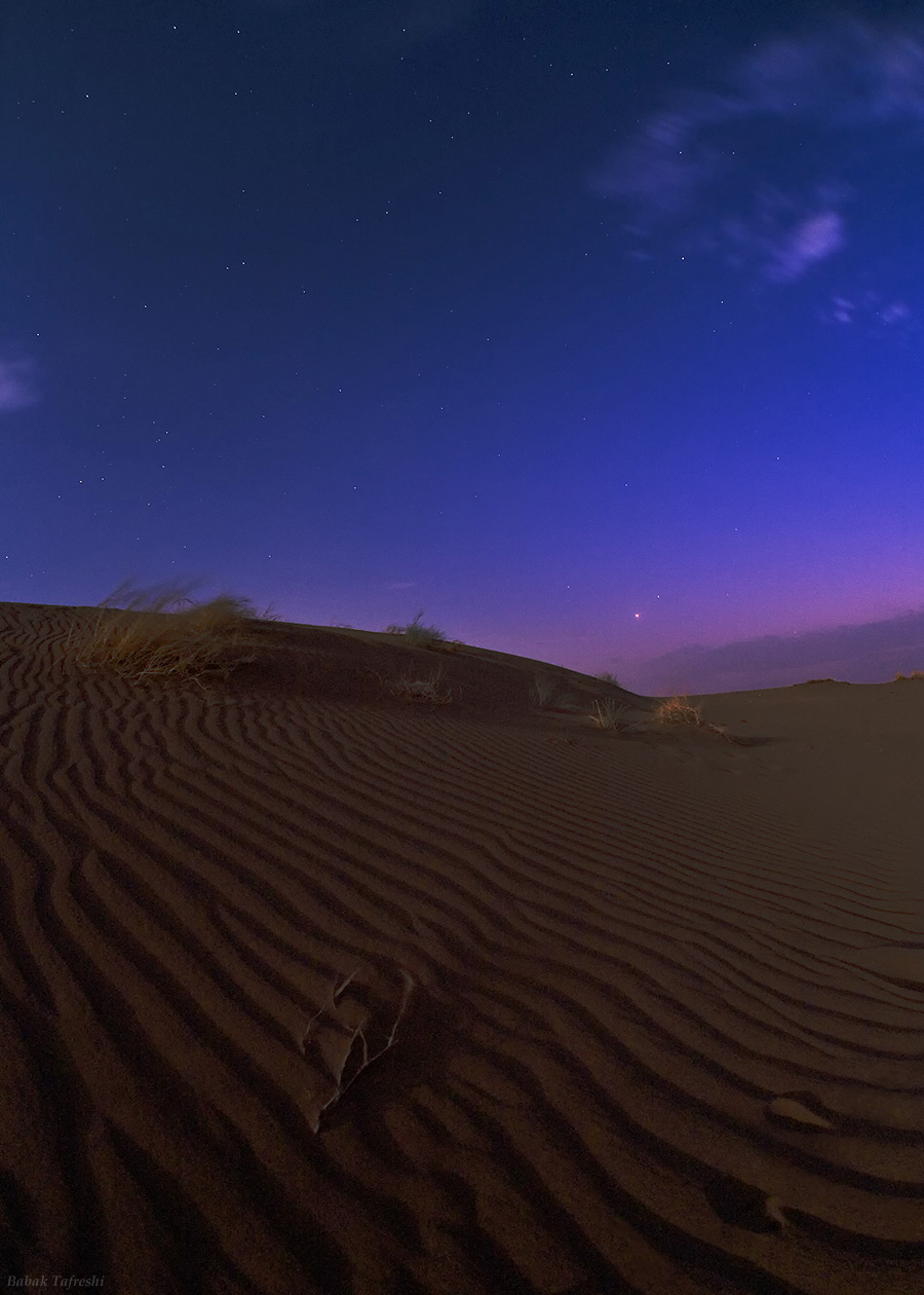 Aunque es posible que hayas leído un correo electrónico afirmando que Marte será increíblemente brillante esta noche, la estrella más brillante en el horizonte no es Marte. Desde el centro de Irán el 24 de agosto, la estrella más brillante en este cielo desértico de crepúsculo es Venus, también conocido como la Estrella del Oeste. Pero Marte también aparece en la imagen, justo encima y a la derecha de Venus, que es aún más brillante. A pesar de las afirmaciones del engaño anual sobre Marte en internet, que asegura que Marte será tan grande y brillante como la Luna Llena, esta escena celeste es muy similar a la que puedes ver en el cielo occidental esta noche. Junto con Marte, esta hermosa vista incluye a Spica, la estrella alfa de la constelación de Virgo, ubicada encima y a la izquierda de Venus. Más allá de Venus, Saturno asoma a través del desvanecido resplandor del atardecer, justo encima de las nubes. Cerca del horizonte opuesto, la Luna Llena que ilumina el desierto es aproximadamente 400,000 veces más brillante que Marte.
