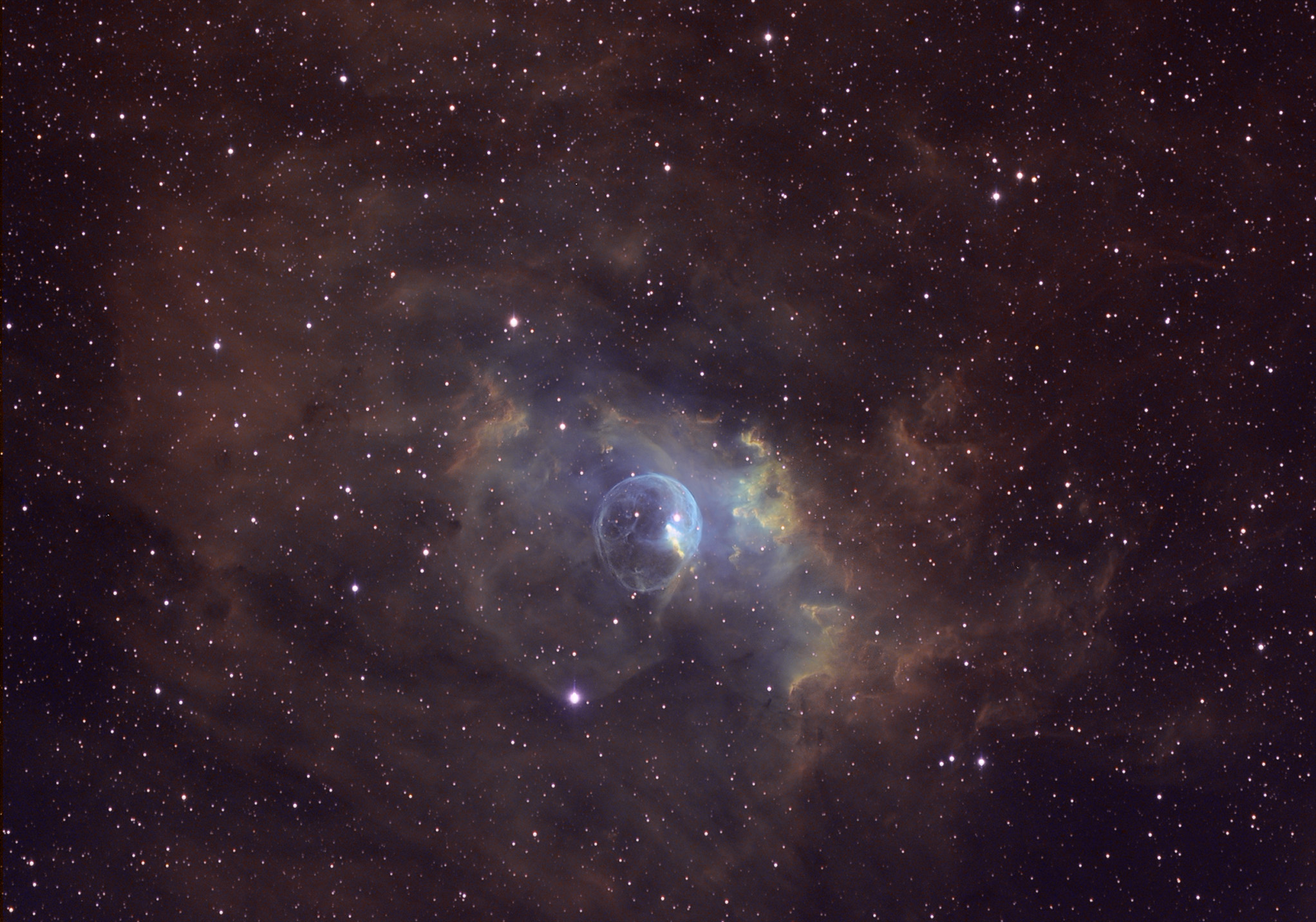Soplada por el viento de una estrella masiva, esta aparición interestelar tiene una forma sorprendentemente familiar. Catalogada como NGC 7635, también se conoce simplemente como La Nebulosa Burbuja. Aunque parece delicada, la burbuja de 10 años luz de diámetro ofrece evidencia de procesos violentos en acción. Arriba y a la derecha del centro de la Burbuja se encuentra una estrella caliente de tipo O, cientos de miles de veces más luminosa y aproximadamente 45 veces más masiva que el Sol. Un viento estelar intenso y una radiación intensa de esa estrella han expulsado la estructura de gas luminoso contra material más denso en una nube molecular circundante. La intrigante Nebulosa Burbuja se encuentra a solo 11 000 años luz de distancia, en dirección a la constelación presumida de Casiopea. Se utilizó una paleta de Hubble en falso color para crear esta imagen nítida y muestra la emisión de átomos de azufre, hidrógeno y oxígeno en tonos rojo, verde y azul. Los datos de la imagen se registraron utilizando un telescopio pequeño bajo cielos claros y estables, desde el Observatorio de Monte Wilson.