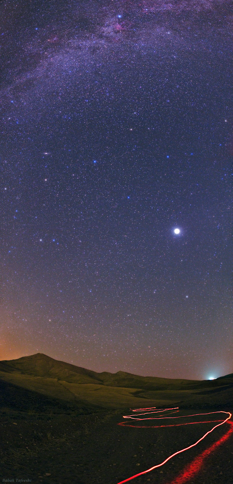 Probablemente la estrella más brillante que has visto últimamente sea en realidad el planeta Júpiter. Júpiter domina el cielo en esta vista etiquetada de una noche estrellada de septiembre desde las montañas Alborz en Irán, completa con la trayectoria de una linterna roja iluminando la carretera de la montaña. El 21 de septiembre (hora universal) Júpiter estará en oposición, el punto opuesto al Sol a lo largo de su órbita, apareciendo justo cuando el Sol se pone. Para esta oposición, Júpiter será ligeramente más brillante y más cercano a la Tierra que en cualquier otro año desde 1963. Mucho más tenue y también acercándose a su propia oposición el 21 de septiembre, está el distante planeta Urano. Muy cerca de Júpiter en el cielo, el planeta más tenue es fácil de localizar con binoculares (similar a la vista insertada), situado claramente por encima y a la derecha de brillante Júpiter y con un brillo similar al de una de las propias lunas galileanas de Júpiter. Curiosamente cerca de la oposición de ambos planetas, el punto del cielo exactamente opuesto al Sol el 23 de septiembre está marcado por el Equinoccio de Primavera. Ese día, una Luna Llena se unirá a la escena celeste. Por supuesto, cualquier Luna Llena también está en oposición.