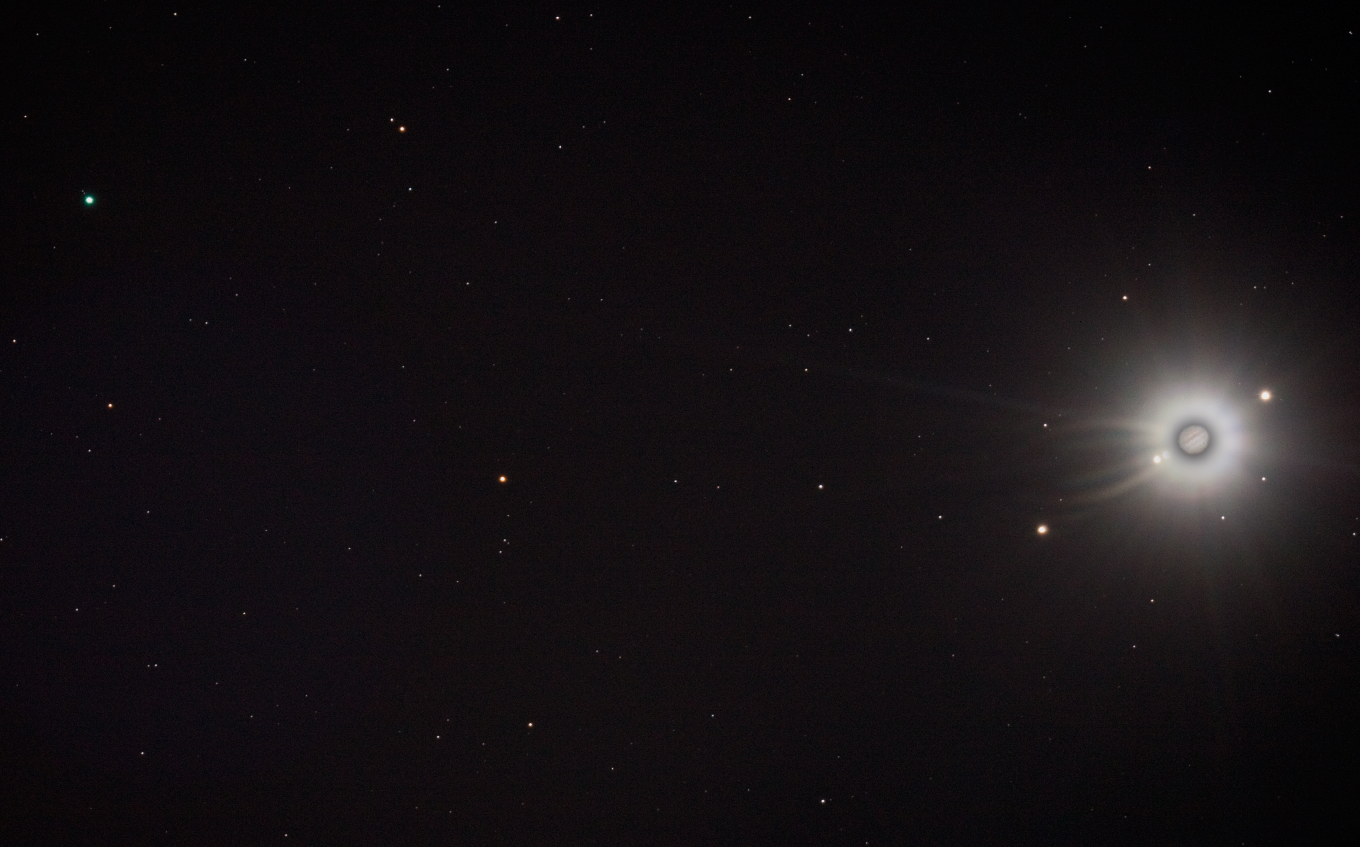 A finales de septiembre, dos planetas estaban opuestos al Sol en el cielo terrestre: Júpiter y Urano. Por lo tanto, ambos estaban cerca de la Tierra, a una distancia de solo 33 minutos luz y 2,65 horas luz respectivamente, convirtiéndolos en buenos objetivos para observadores con telescopio. Registrada el 27 de septiembre, esta composición bien planificada de exposiciones múltiples consecutivas capturó a ambos gigantes gaseosos en su notable alineamiento celestial, acompañados por sus lunas más brillantes. El disco verde pálido del distante planeta Urano se encuentra cerca de la esquina superior izquierda. De las 5 lunas más grandes del planeta inclinado, dos se pueden observar justo encima y a la izquierda del disco planetario. Ambas descubiertas por el astrónomo británico del siglo XVIII, el Sir William Herschel, y posteriormente nombradas en honor a personajes de la obra de Shakespeare Sueño de una noche de verano, Oberón está más a la izquierda, con Titania más cerca. En el lado derecho del marco se encuentra el gigante gaseoso dominante Júpiter, flanqueado a lo largo de una línea por sus cuatro satélites galileanos. Más alejado de Júpiter está Calisto, con Europa e Io a la izquierda del disco planetario, mientras que Ganímedes se encuentra solo a la derecha.