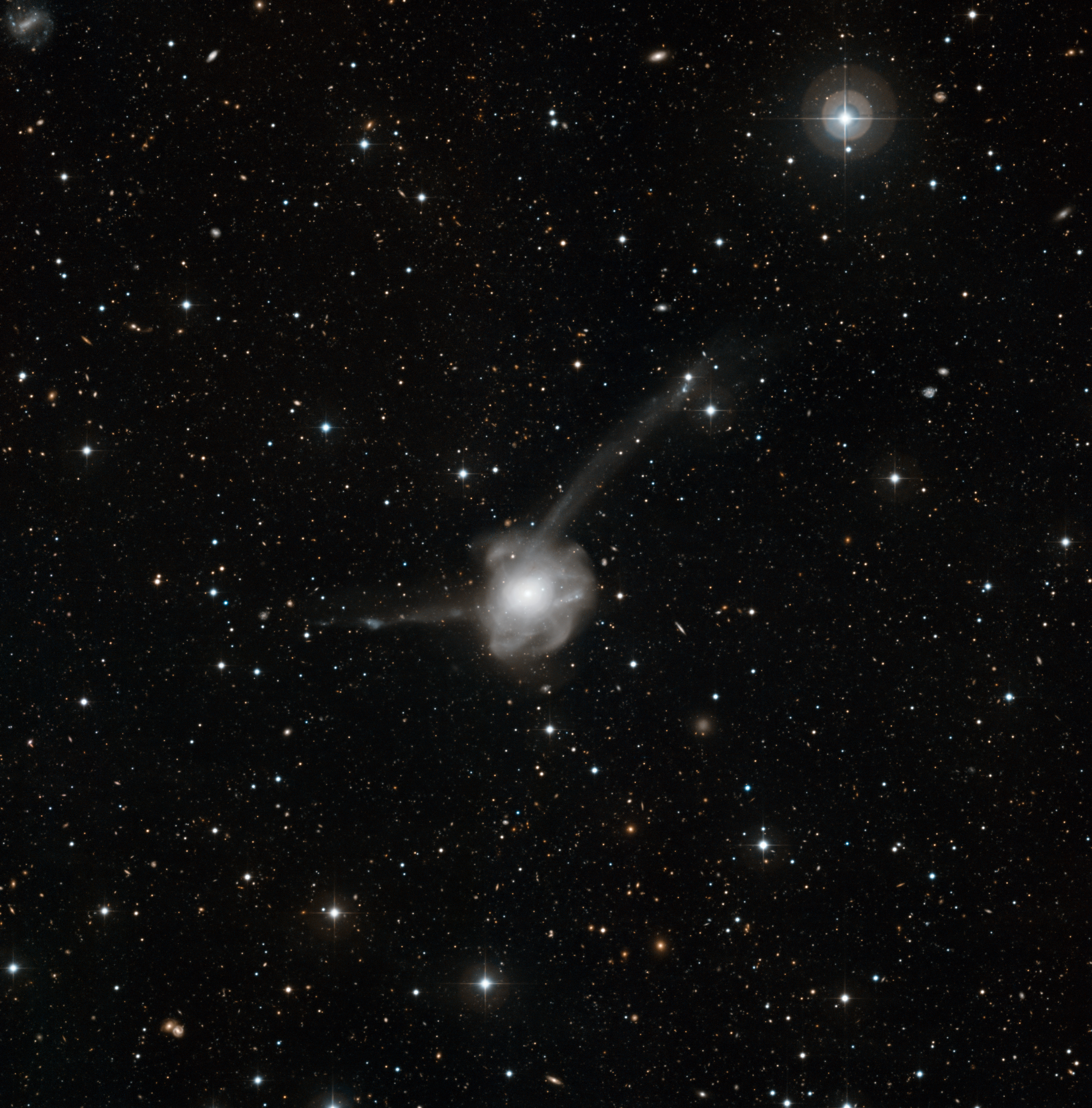 ¿Es esto lo que le ocurrirá a nuestra galaxia Vía Láctea? Quizás sí, si colisionamos con la galaxia de Andrómeda dentro de unos pocos miles de millones de años. La imagen mostrada arriba es la de NGC 7252, un revoltijo de estrellas creado por una colisión masiva entre dos grandes galaxias. La colisión tomará cientos de millones de años y, por lo tanto, está efectivamente congelada en el tiempo en la imagen anterior. El caos resultante ha sido apodado la galaxia Atoms-for-Peace debido a su similitud con un dibujo de un gran átomo. La imagen anterior fue tomada recientemente por el telescopio MPG/ESO de 2,2 metros en Chile. NGC 7252 abarca aproximadamente 600 000 años luz y se encuentra a unos 220 millones de años luz de distancia, en dirección a la constelación del Acuario (Aquarius). Dado que la velocidad lateral de la galaxia de Andrómeda (M31) es actualmente desconocida, nadie sabe con certeza si la Vía Láctea colisionará alguna vez con M31.
