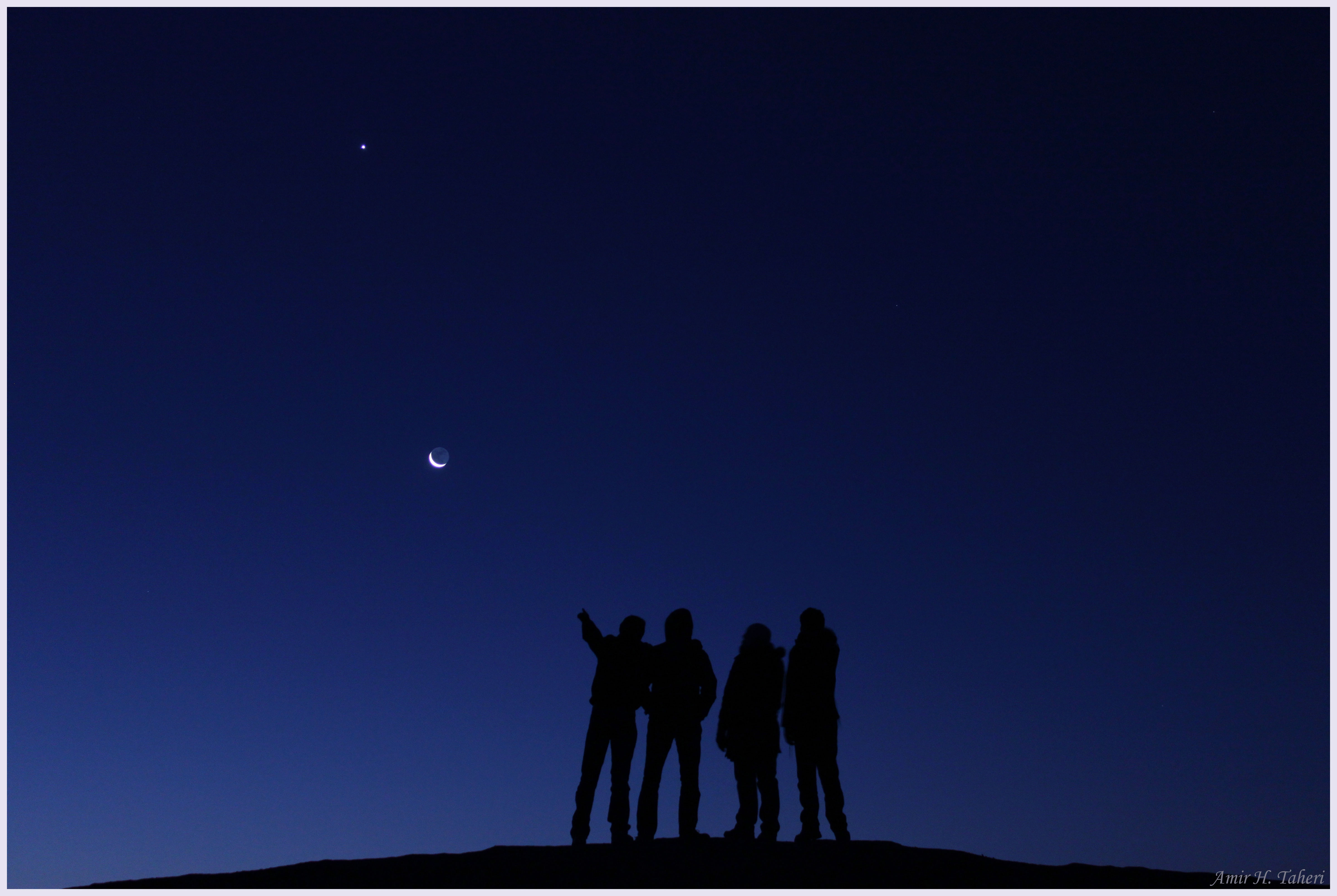 Have you contemplated your sky recently? Tonight will be a good one for midnight meditators at many northerly locations as meteors from the Geminids meteor shower will frequently streak through. The Geminds meteor shower has slowly been building to a crescendo and should peak tonight. Pictured above ten days ago, a group of celestial sightseers in the Maranjab Desert in Iran, were treated to a dark and wondrous pre-dawn sky that contained the planet Venus and a crescent Moon. Tonight Mars and Mercury should be visible just above the southwestern horizon at sunset, while the first quarter Moon will set around midnight.