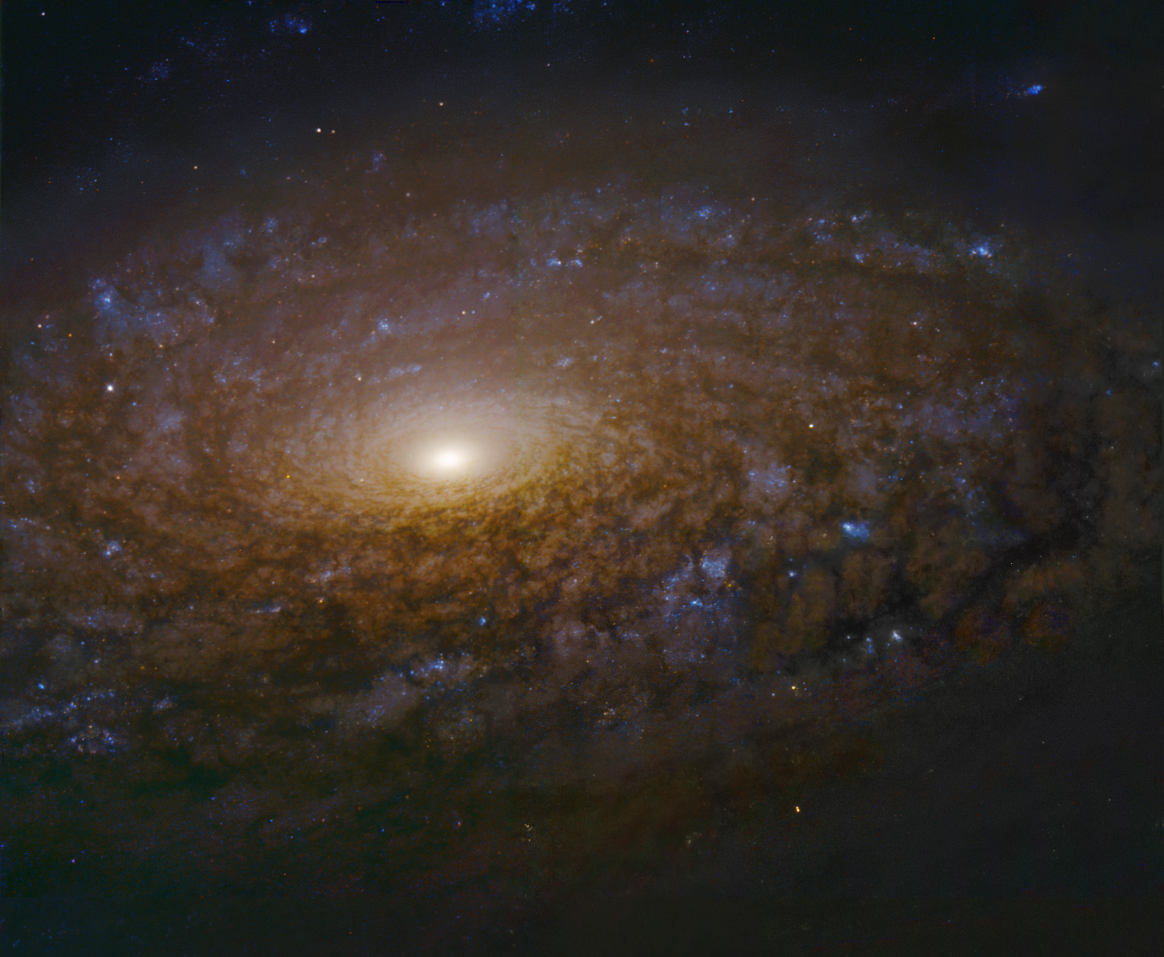 Gorgeous spiral galaxy NGC 3521 is a mere 35 million light-years distant, toward the constellation Leo. Spanning some 50,000 light-years, its central region is shown in this dramatic image, constructed from data drawn from the Hubble Legacy Archive. The close-up view highlights this galaxy's characteristic multiple, patchy, irregular spiral arms laced with dust and clusters of young, blue stars. In contrast, many other spirals exhibit grand, sweeping arms. A relatively bright galaxy in planet Earth's sky, NGC 3521 is easily visible in small telescopes, but often overlooked by amateur imagers in favor of other Leo spiral galaxies, like M66 and M65.