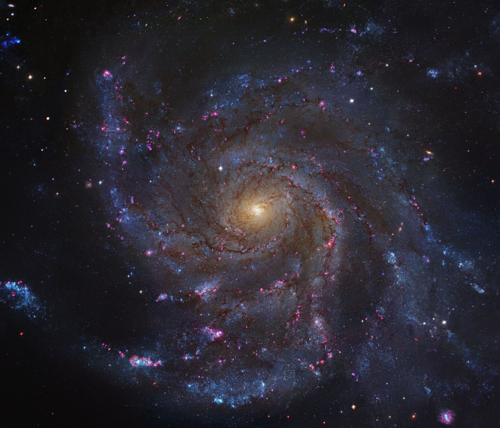 Big, beautiful spiral galaxy M101 is one of the last entries in Charles Messier's famous catalog, but definitely not one of the least. About 170,000 light-years across, this galaxy is enormous, almost twice the size of our own Milky Way galaxy. M101 was also one of the original spiral nebulae observed by Lord Rosse's large 19th century telescope, the Leviathan of Parsontown. This mosaic of M101 was assembled from Hubble Legacy Archive data. Additional ground-based data was included to further define the telltale reddish emission from atomic hydrogen gas in this gorgeous galaxy's star forming regions. The sharp image shows stunning features in the galaxy's face-on disk of stars and dust along with background galaxies, some visible right through M101 itself. Also known as the Pinwheel Galaxy, M101 lies within the boundaries of the northern constellation Ursa Major, about 25 million light-years away.