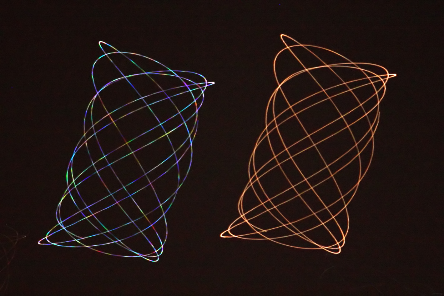 On June 4, 2010 Regulus, alpha star of the constellation Leo, and wandering planet Mars were at about the same apparent brightness, separated on the sky by 1.5 degrees. An ingenious and creative 10 second exposure from a swinging camera recorded these gyrating trails of the celestial pairing. Can you tell which trail belongs to the star and which to the planet? Hint: atmospheric turbulence causes the image of the star to scintillate or vary in brightness and color more readily than the planet. The scintillation is more pronounced because the star is effectively a point source of light seen as a narrow bundle of light rays. Rapidly changing refraction due to turbulence along the line of sight affects different colors of light by different amounts and generally produces a twinkling effect for stars. But Mars is much closer than the distant stars and an extended source of light. Though tiny, its disk is seen as a bundle of light rays that is substantially broader compared to a star's and so, on average, less affected by small scale turbulence. The result is the varied, rainbow like trail for Regulus (left) and the steadier, consistently reddish trail for Mars.