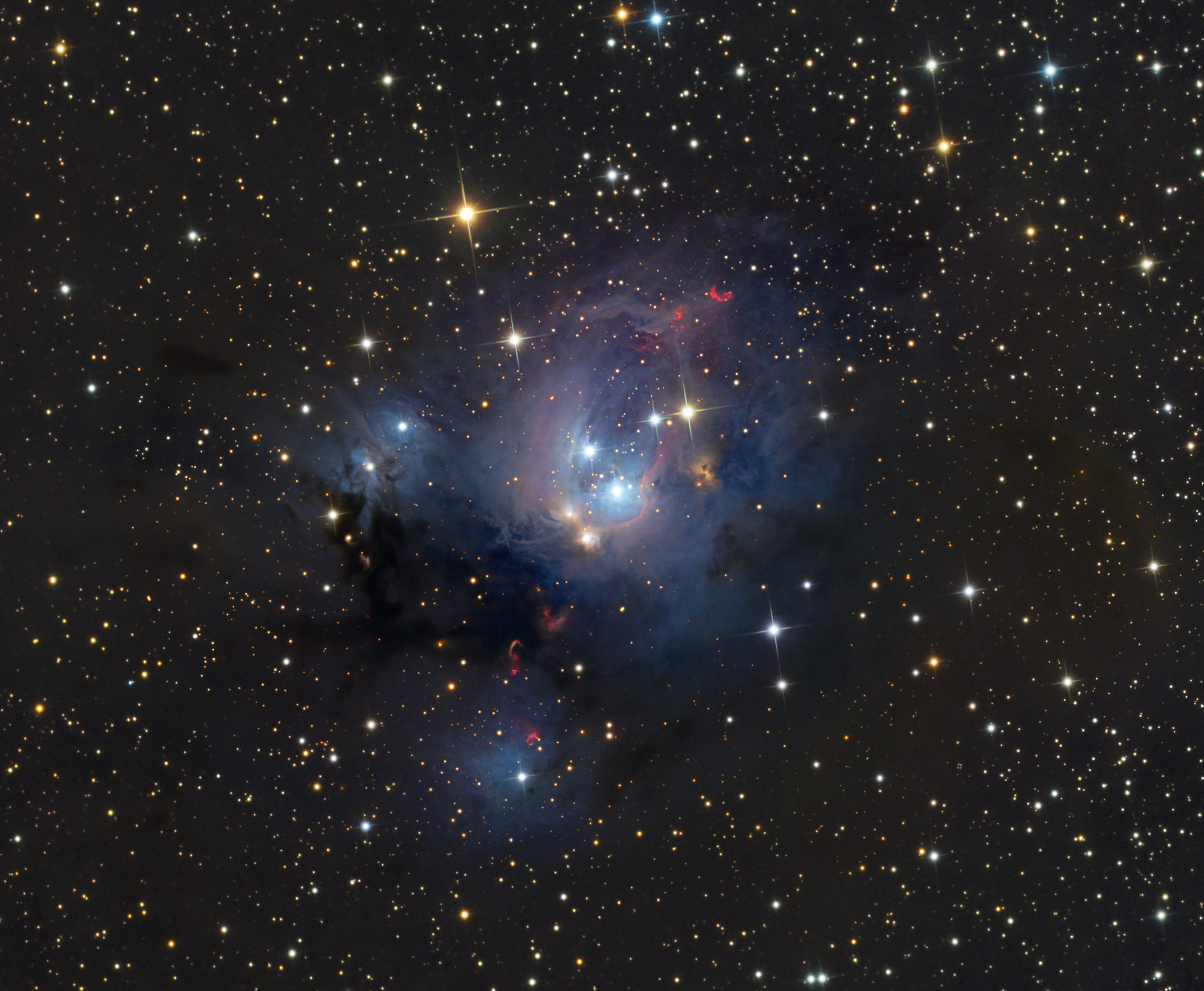 Soles jóvenes aún residen en el interior de la nebulosa polvorienta NGC 7129, a unos 3.000 años-luz de distancia en dirección a la real constelación de Cefeo. Aunque estas estrellas se encuentran en una edad relativamente temprana —con apenas unos pocos millones de años—, es probable que nuestro propio Sol se haya formado en una nursería estelar similar hace unos cinco mil millones de años. Lo más destacado en esta nítida imagen son las hermosas nubes de polvo azuladas que reflejan la luz de estas estrellas jóvenes. Sin embargo, las compactas formas de media luna de color rojo intenso son también indicadores de objetos estelares jóvenes y energéticos. Conocidos como objetos Herbig-Haro, su forma y color son característicos del hidrógeno gaseoso luminiscente perturbado por chorros que emanan de estrellas recién nacidas. Los filamentos más tenues y extendidos de emisión rojiza que se mezclan con las nubes azuladas son producidos por granos de polvo que convierten eficientemente la luz ultravioleta invisible en luz roja visible mediante fotoluminiscencia. En última instancia, el gas y el polvo primordiales de la región se dispersarán, y las estrellas se irán separando a medida que el cúmulo difuso orbita alrededor del centro de la Galaxia. A la distancia estimada de NGC 7129, este campo telescópico abarca aproximadamente 40 años-luz.