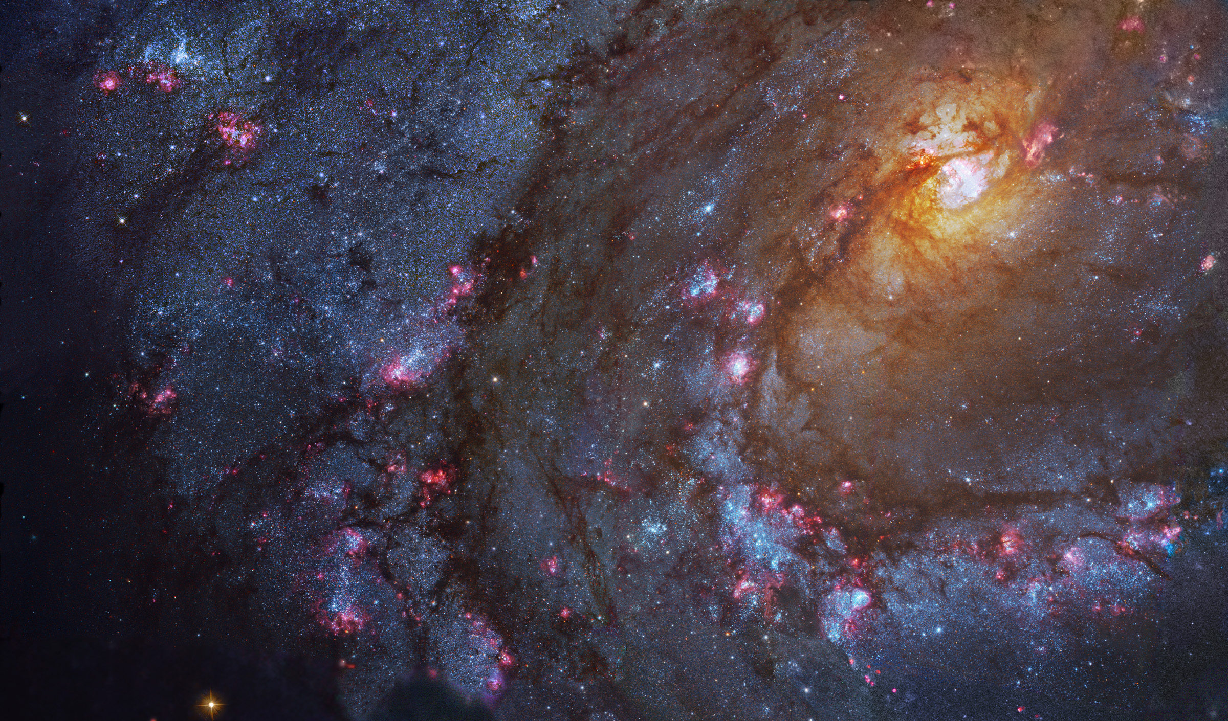 Grande, brillante y hermosa, la galaxia espiral M83 se encuentra a tan solo doce millones de años luz de distancia, cerca del extremo sureste de la muy extensa constelación de Hydra. Esta detallada imagen cósmica, un mosaico basado en datos del Archivo Legado del Hubble, muestra polvo oscuro y jóvenes cúmulos estelares azules a lo largo de sus prominentes brazos espirales, que le otorgan a M83 su apodo: la Rueda de Viento del Sur. Típicamente ubicadas cerca de los bordes de los gruesos carriles de polvo, una abundancia de rojizas regiones de formación estelar sugiere otro popular sobrenombre para M83: la Galaxia de los Mil Rubíes. Dominado por la luz de estrellas más antiguas, el brillante núcleo amarillento de M83 se encuentra en la parte superior derecha. Dicho núcleo también es brillante en energías de rayos X, lo que revela una alta concentración de estrellas de neutrones y agujeros negros resultantes de un intenso episodio de formación estelar. De hecho, M83 es miembro de un grupo de galaxias que incluye a la galaxia activa Centaurus A. El campo de visión de esta imagen de detalle abarca más de 25.000 años luz a la distancia estimada de M83.