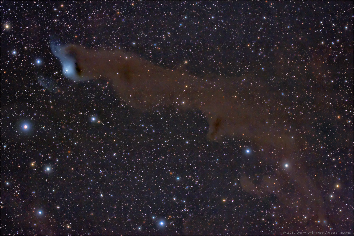 The mysterious blue reflection nebula found in catalogs as VdB 152 or Ced 201 really is very faint. It lies at the tip of the long dark nebula Barnard 175 in a dusty complex that has also been called Wolf's Cave. The cosmic apparitions are nearly 1,400 light-years away along the northern Milky Way in the royal constellation Cepheus. Near the edge of a large molecular cloud, pockets of interstellar dust in the region block light from background stars or scatter light from the embedded bright star giving the the nebula its characteristic blue color. Ultraviolet light from the star is also thought to cause a dim reddish luminescence in the nebular dust. Though stars do form in molecular clouds, this star seems to have only accidentally wandered into the area, as its measured velocity through space is very different from the cloud's velocity. This deep telescopic image of the region spans about 7 light-years. Poll: Which of October's APODs should be the APOM?