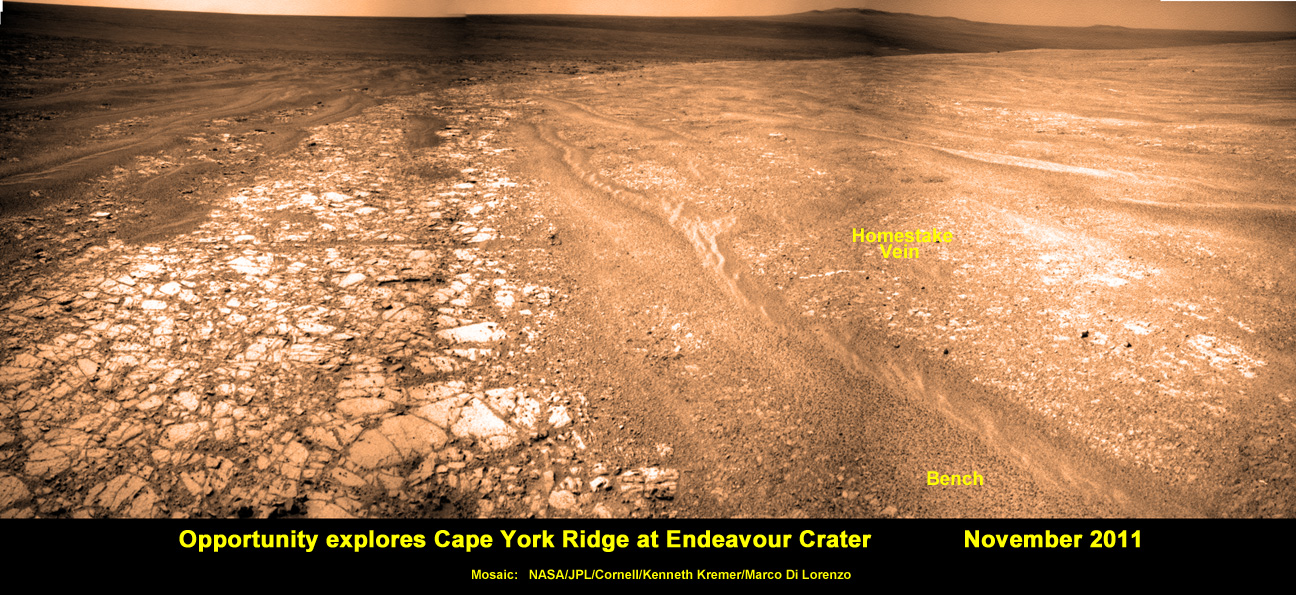 ¿Qué podría haber creado esta inusual veta de roca en Marte? La hipótesis más aceptada es que esta delgada capa de roca, denominada «Homestake», fue depositada por un líquido en movimiento, tal como ocurre con la mayoría de las vetas minerales en la Tierra. Y el líquido más probable es el agua. Por lo tanto, esta franja mineral —rica en calcio y azufre— representa la evidencia más reciente dentro del creciente conjunto de indicios de que una parte de Marte tuvo un pasado acuoso. Esto, a su vez, incrementa la especulación de que Marte fue alguna vez hospitalario para la vida. En la imagen se muestra una panorámica tomada cerca del borde occidental del Cráter Endeavour por el róver Opportunity, que explora actualmente la superficie marciana. La imagen insertada muestra un primer plano de la veta mineral recientemente descubierta.