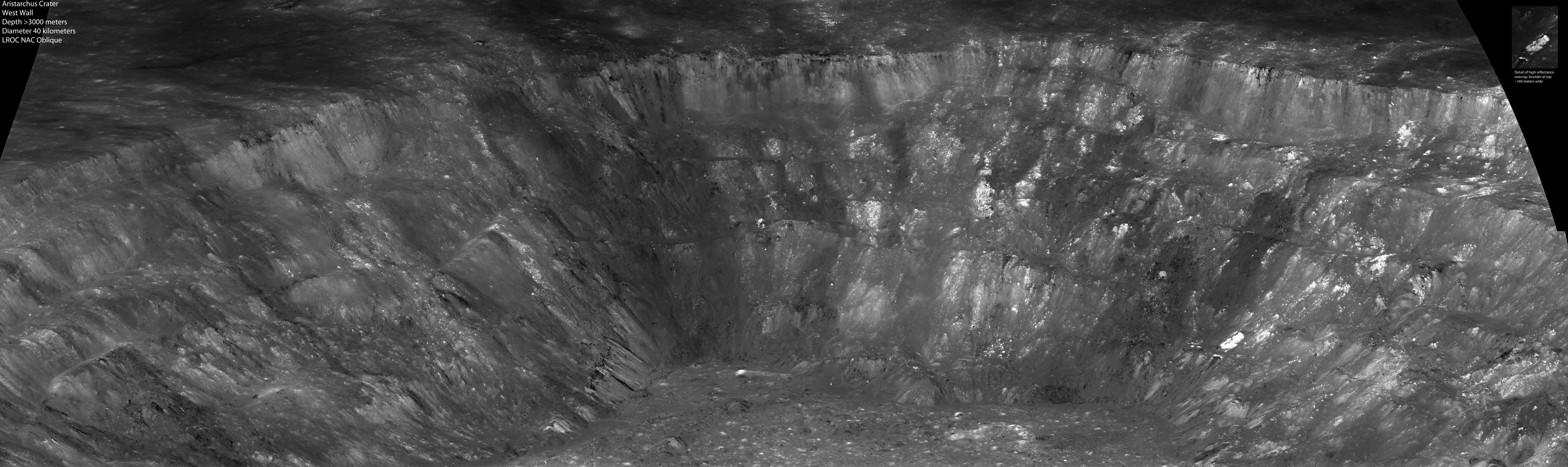 La Meseta Aristarchus está anclada en las vastas coladas de lava del Océano de las Tormentas (Oceanus Procellarum) de la Luna. En el extremo sureste de la meseta se encuentra el espectacular Cráter Aristarchus, un cráter de impacto de 40 kilómetros de diámetro y 3 kilómetros de profundidad. Al recorrer este notable panorama, el observador se encuentra contemplando directamente la pared oeste del cráter a lo largo de unos 25 kilómetros. Entre los elementos visibles en la pared escalonada se encuentran depósitos oscuros de material fundido y escombros por impacto, material brillante excavado y bloques de roca de más de 100 metros de diámetro. Con una resolución máxima de 1,6 metros por píxel, el nítido mosaico fue creado a partir de imágenes captadas por la cámara de ángulo estrecho del Orbitador de Reconocimiento Lunar en noviembre de 2011. El punto de observación del orbitador se encontraba a 70 kilómetros al este del centro del cráter y apenas a 26 kilómetros por encima de la superficie lunar.