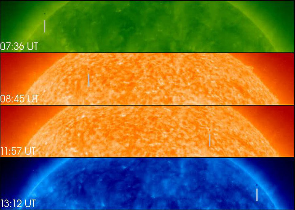 Can you spot the planet? The diminutive disk of Mercury, the solar system's innermost planet, spent about five hours crossing in front of the enormous solar disk in 2003, as viewed from the general vicinity of planet Earth. The Sun was above the horizon during the entire transit for observers in Europe, Africa, Asia, or Australia, and the horizon was certainly no problem for the sun-staring SOHO spacecraft. Seen as a dark spot, Mercury progresses from left to right (top panel to bottom) in these four images from SOHO's extreme ultraviolet camera. The panels' false-colors correspond to different wavelengths in the extreme ultraviolet which highlight regions above the Sun's visible surface. This was the first of 14 transits of Mercury which will occur during the 21st century. Next week, however, an event much more rare but easier to spot will occur -- a transit of Venus across the Sun. Need help spotting Mercury? Just click on the picture. New Image Feeds: APOD River on Google Plus and APOD Sky on Facebook