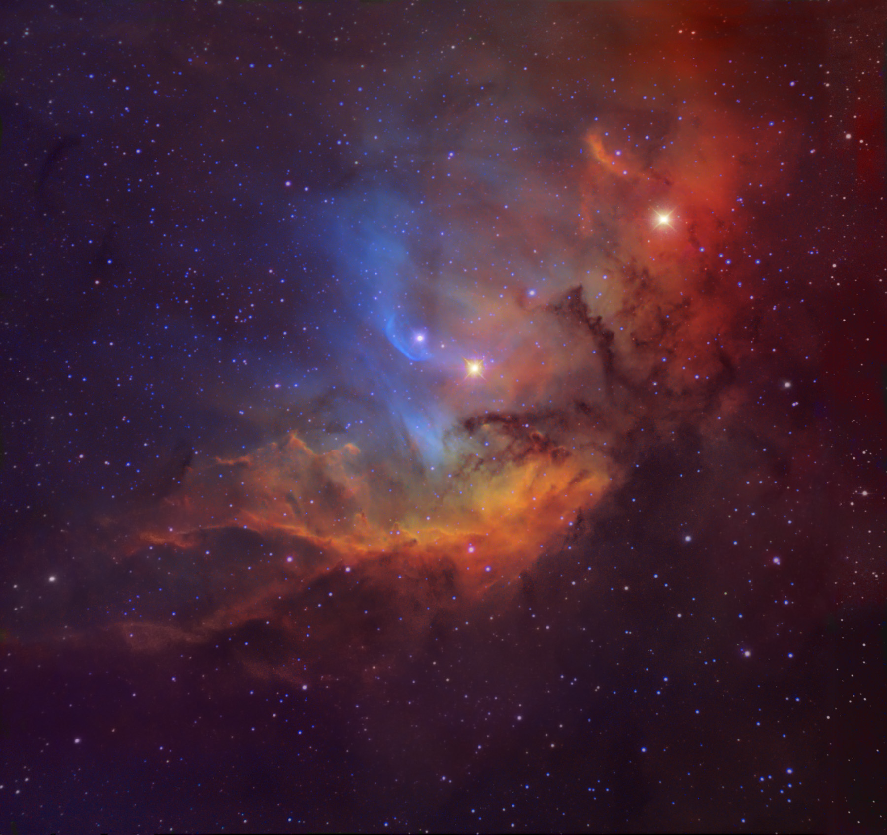 Framing a bright emission region this telescopic view looks out along the plane of our Milky Way Galaxy toward the nebula rich constellation Cygnus the Swan. Popularly called the Tulip Nebula the glowing cloud of interstellar gas and dust is also found in the 1959 catalog by astronomer Stewart Sharpless as Sh2-101. About 8,000 light-years distant the nebula is understandably not the only cosmic cloud to evoke the imagery of flowers. The complex and beautiful nebula is shown here in a composite image that maps emission from ionized sulfur, hydrogen, and oxygen atoms into red, green, and blue colors. Ultraviolet radiation from young, energetic O star HDE 227018 ionizes the atoms and powers the emission from the Tulip Nebula. HDE 227018 is the bright star very near the blue arc at image center.