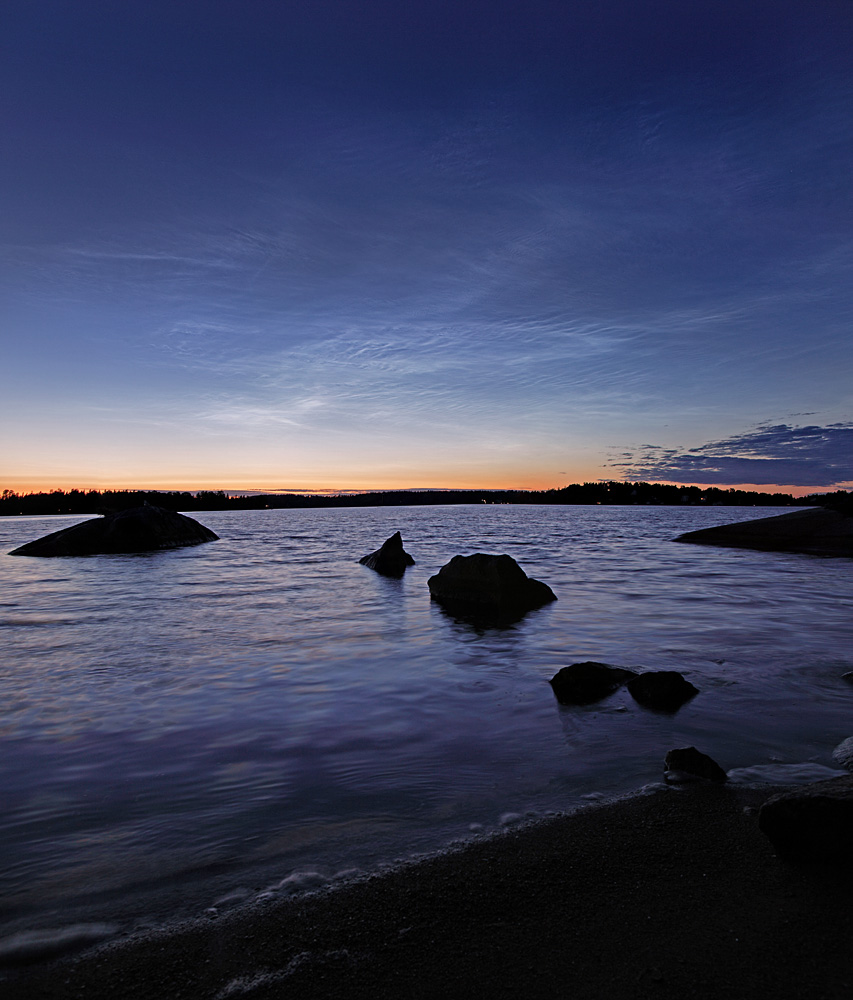 Noctilucent or night-shining clouds lie near the edge of space. From about 80 kilometers above Earth's surface, the icy clouds can still reflect sunlight even though the Sun itself is below the horizon as seen from the ground. Usually occurring at high latitudes in summer months, the diaphanous apparitions are also known as polar mesospheric clouds and may be connected to global change in the lower atmosphere. This serene view features a lovely display of noctilucent clouds over water recorded last month near the coastal town of Vaxholm, Sweden. The picture was taken near local midnight.
