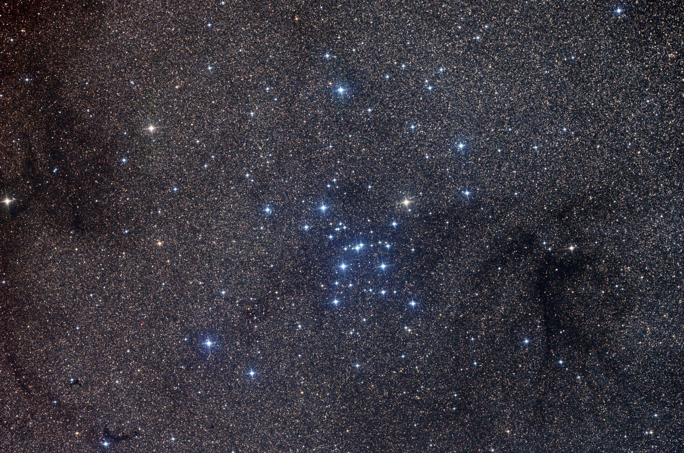 M7 is one of the most prominent open clusters of stars on the sky. The cluster, dominated by bright blue stars, can be seen with the naked eye in a dark sky in the tail of the constellation of the Scorpion (Scorpius). M7 contains about 100 stars in total, is about 200 million years old, spans 25 light-years across, and lies about 1000 light-years away. The above deep exposure was taken from Hakos Farm in Namibia. The M7 star cluster has been known since ancient times, being noted by Ptolemy in the year 130 AD. Also visible are a dark dust cloud and literally millions of unrelated stars towards the Galactic center.