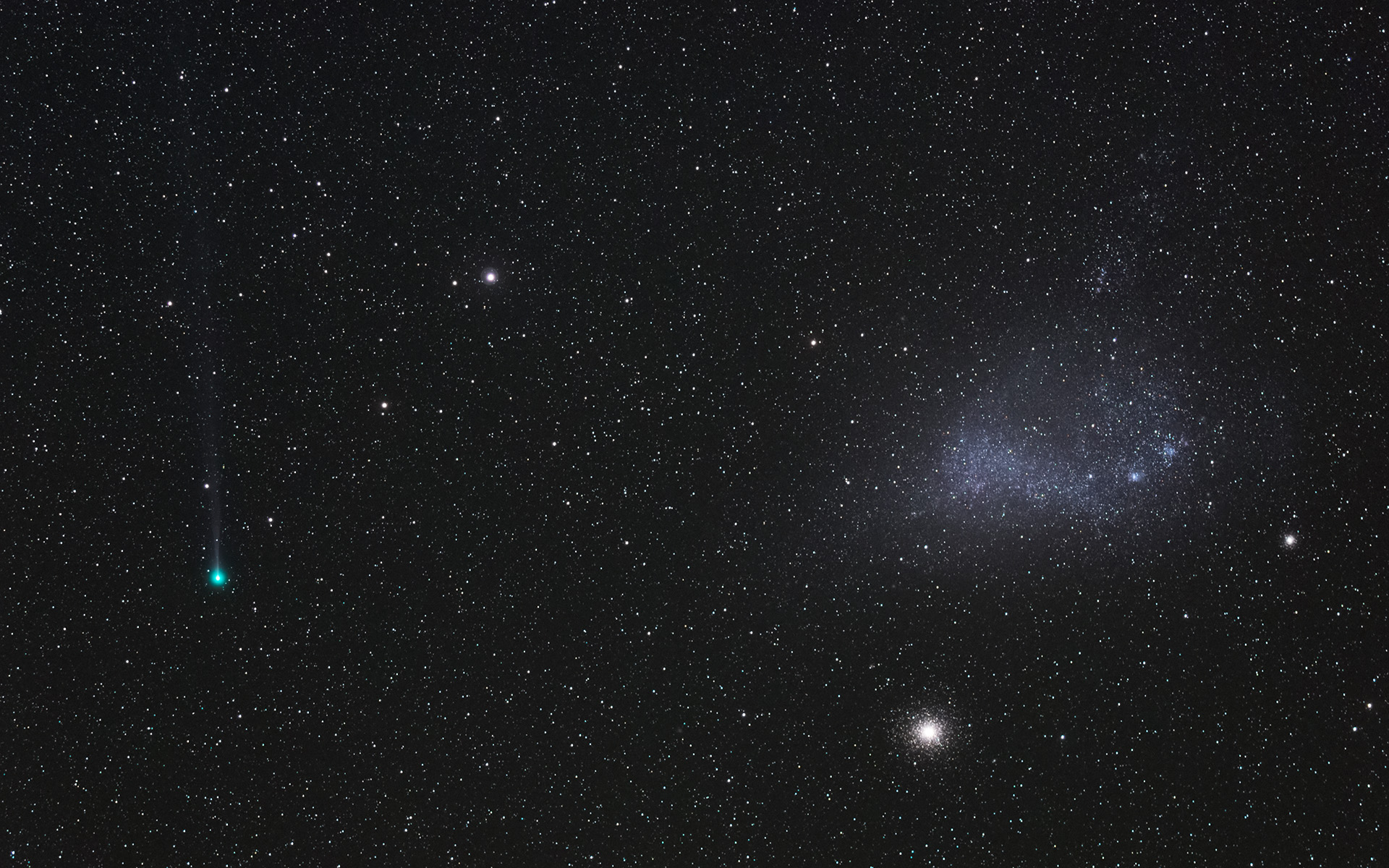 Actualmente, el cometa Lemmon (C/2012 F6) y el cometa PanSTARRS (C/2011 L4) están recorriendo los cielos del sur. La coma de color verde lima y la delgada cola del cometa Lemmon se encuentran cerca del borde izquierdo de esta escena capturada con teleobjetivo, una única imagen de un video de timelapse (vimeo aquí) grabado el 12 de febrero, mostrando su movimiento frente a las estrellas de fondo. La trayectoria del cometa Lemmon lo acercó a la línea de visión hacia tesoros destacados del cielo del sur, la Nube Magallánica Pequeña y el cúmulo globular 47 Tucanae (a la derecha). Con una cola más amplia y de color blanco, el cometa PanSTARRS aparece en imágenes posteriores del video, moviéndose a través de la tenue constelación de Microscopio. Visibles con binoculares y pequeños telescopios, ambos cometas están aumentando su brillo y dirigiéndose hacia los cielos del norte en los próximos meses.