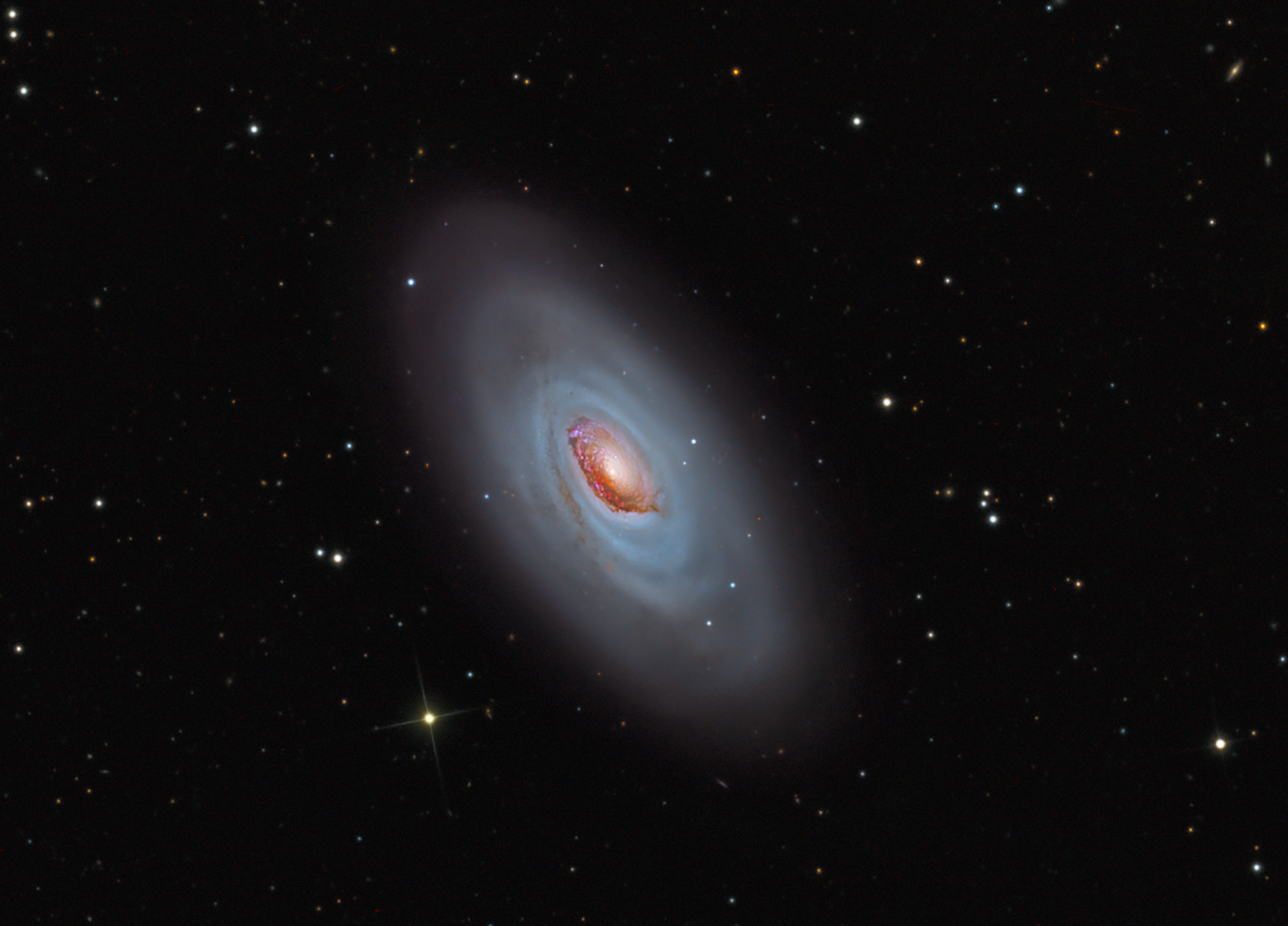This beautiful, bright, spiral galaxy is Messier 64, often called the Black Eye Galaxy or the Sleeping Beauty Galaxy for its heavy-lidded appearance in telescopic views. M64 is about 17 million light-years distant in the otherwise well-groomed northern constellation Coma Berenices. In fact, the Red Eye Galaxy might also be an appropriate moniker in this colorful composition of narrow and wideband images. The enormous dust clouds obscuring the near-side of M64's central region are laced with the telltale reddish glow of hydrogen associated with star forming regions. But they are not this galaxy's only peculiar feature. Observations show that M64 is actually composed of two concentric, counter-rotating systems. While all the stars in M64 rotate in the same direction as the interstellar gas in the galaxy's central region, gas in the outer regions, extending to about 40,000 light-years, rotates in the opposite direction. The dusty eye and bizarre rotation is likely the result of a billion year old merger of two different galaxies.