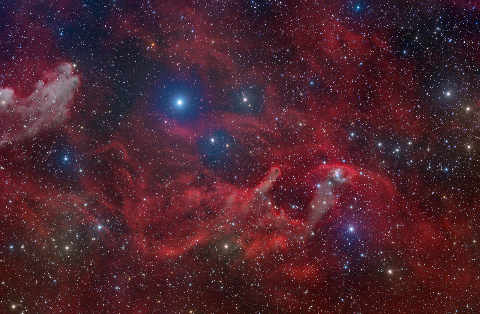 This skyscape finds an esthetic balance of interstellar dust and gas residing in the suburbs of the nebula rich constellation of Orion. Reflecting the light of bright star Rigel, Beta Orionis, the jutting, bluish chin of the Witch Head Nebula is at the upper left. Whiskers tracing the red glow of hydrogen gas ionized by ultraviolet starlight seem to connect that infamous visage with smaller nebulae, like dusty reflection nebula NGC 1788 at the right. Strong winds from Orion's bright stars have also shaped NGC 1788, and likely triggered the formation of the young stars within. Appropriate for its location, NGC 1788 looks to some like a cosmic bat. The scene spans about 3 degrees on the sky or 6 full Moons.