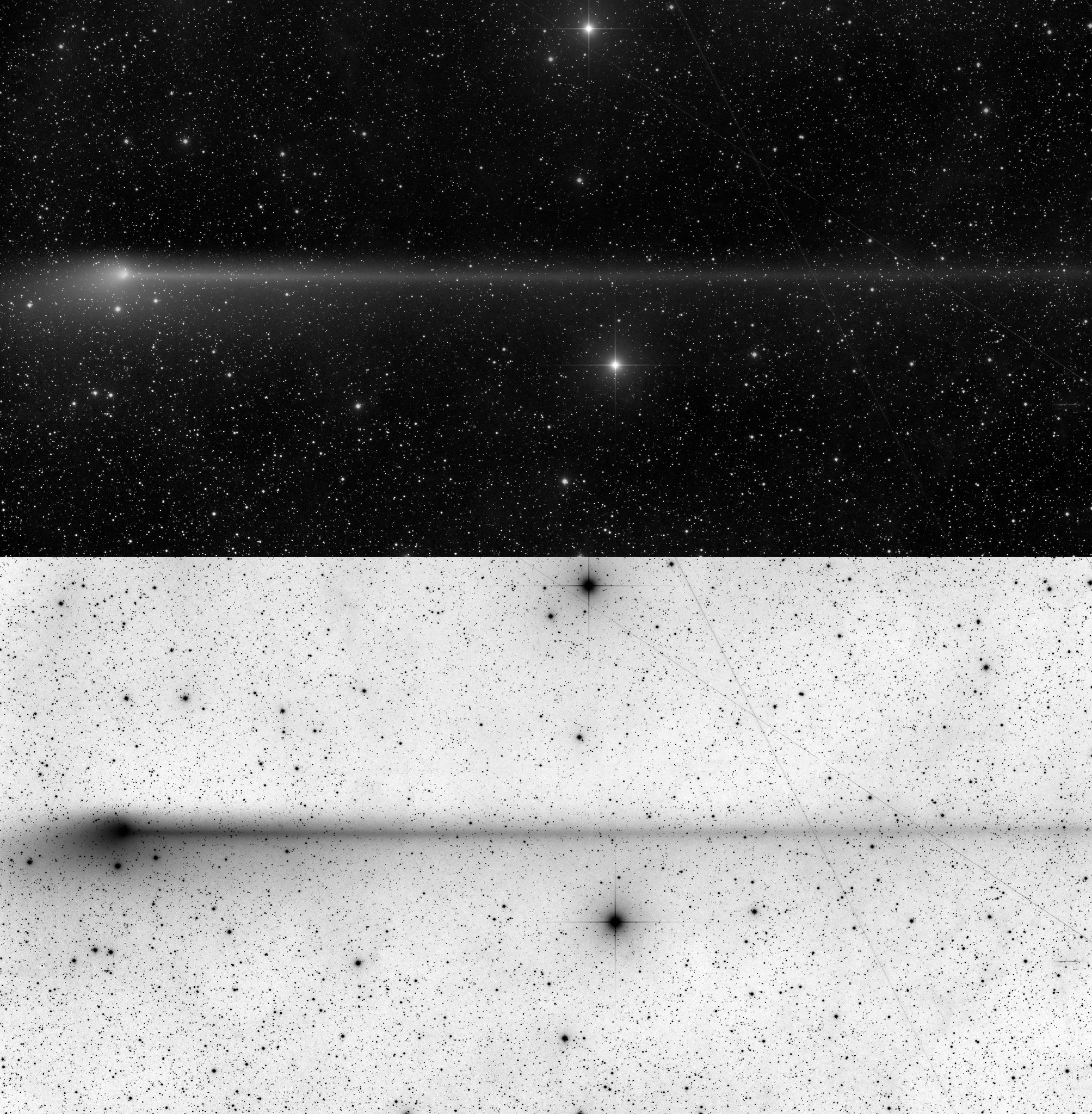Cuando la Tierra se acercó al plano de la órbita del cometa PanSTARRS (C/2011 L4) el 23 de mayo, los observadores de cometas tuvieron la oportunidad de ver esta magnífica anti-cola. La larga y estrecha anti-cola se extiende hacia la derecha en esta imagen durante casi 4 grados, o aproximadamente 8 veces el tamaño angular de la Luna llena. El polvo que forma la anti-cola se extiende a lo largo de la órbita del cometa mientras se aleja del sistema solar interior. Una perspectiva casi perpendicular desde el plano orbital del cometa en su trayectoria de salida mejora la visión de la anti-cola y la hace parecer apuntar hacia la dirección del Sol, aparentemente contraria al comportamiento de las colas de polvo de los cometas empujadas hacia afuera por la presión de la luz solar. Al moverse muy al norte en los cielos terrestres, el cometa está visible durante toda la noche para la mayor parte del hemisferio norte, pero ahora la brillante luz de la luna interfiere con su visibilidad. La anti-cola de PanSTARRS es una de las más largas desde la aparición del cometa Arend-Roland en 1957.
