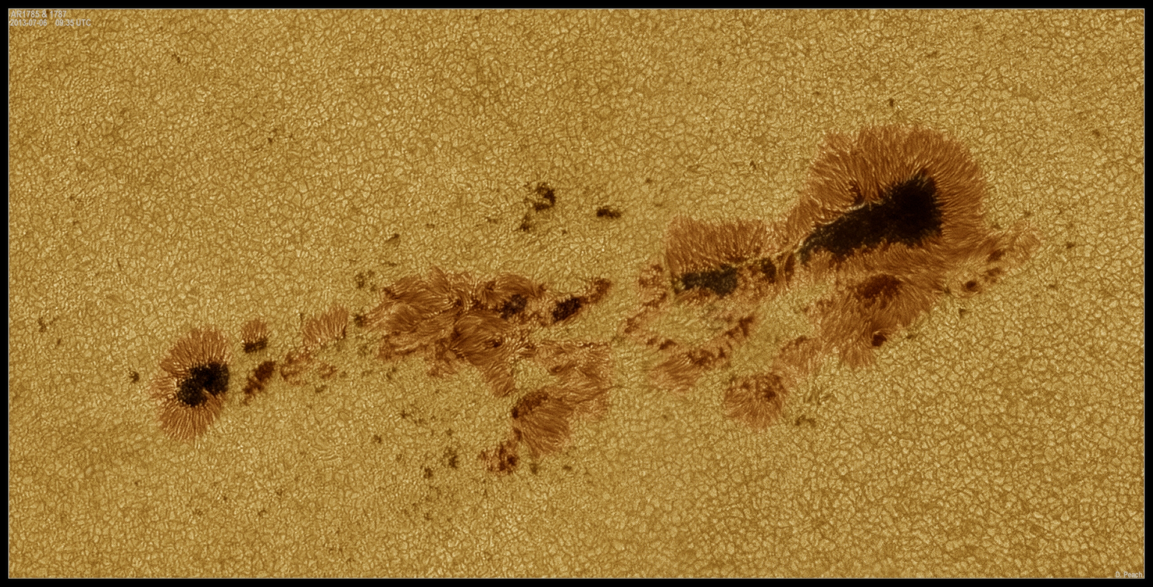 Una de las regiones de manchas solares más grandes de los últimos años está ahora cruzando el Sol. Esta región de campos magnéticos entrelazados podría bien producir una eyección de masa coronal que libere una nube de partículas energéticas al Sistema Solar. Si una nube muy potente impactara la magnetosfera terrestre, podría representar un peligro para los astronautas y satélites en órbita terrestre. Por el contrario, el impacto de una nube menos energética podría provocar auroras espectaculares. La imagen mostrada corresponde a la región de la mancha solar tal como apareció hace dos días. La parte más a la derecha de esta región ha sido catalogada como AR 11785, mientras que la parte izquierda se llama AR 11787. Las regiones más oscuras de las manchas solares contienen campos magnéticos casi verticales y se llaman umbra, mientras que las regiones circundantes, de color bronce, que muestran con mayor claridad los tubos de flujo magnético alargados, se llaman penumbra. Las granulaciones solares, muchas de ellas con un tamaño aproximado de 1000 km, componen la región de fondo amarilla. Nadie sabe qué hará esta región de manchas solares, pero los investigadores del clima espacial la están monitoreando con atención.
