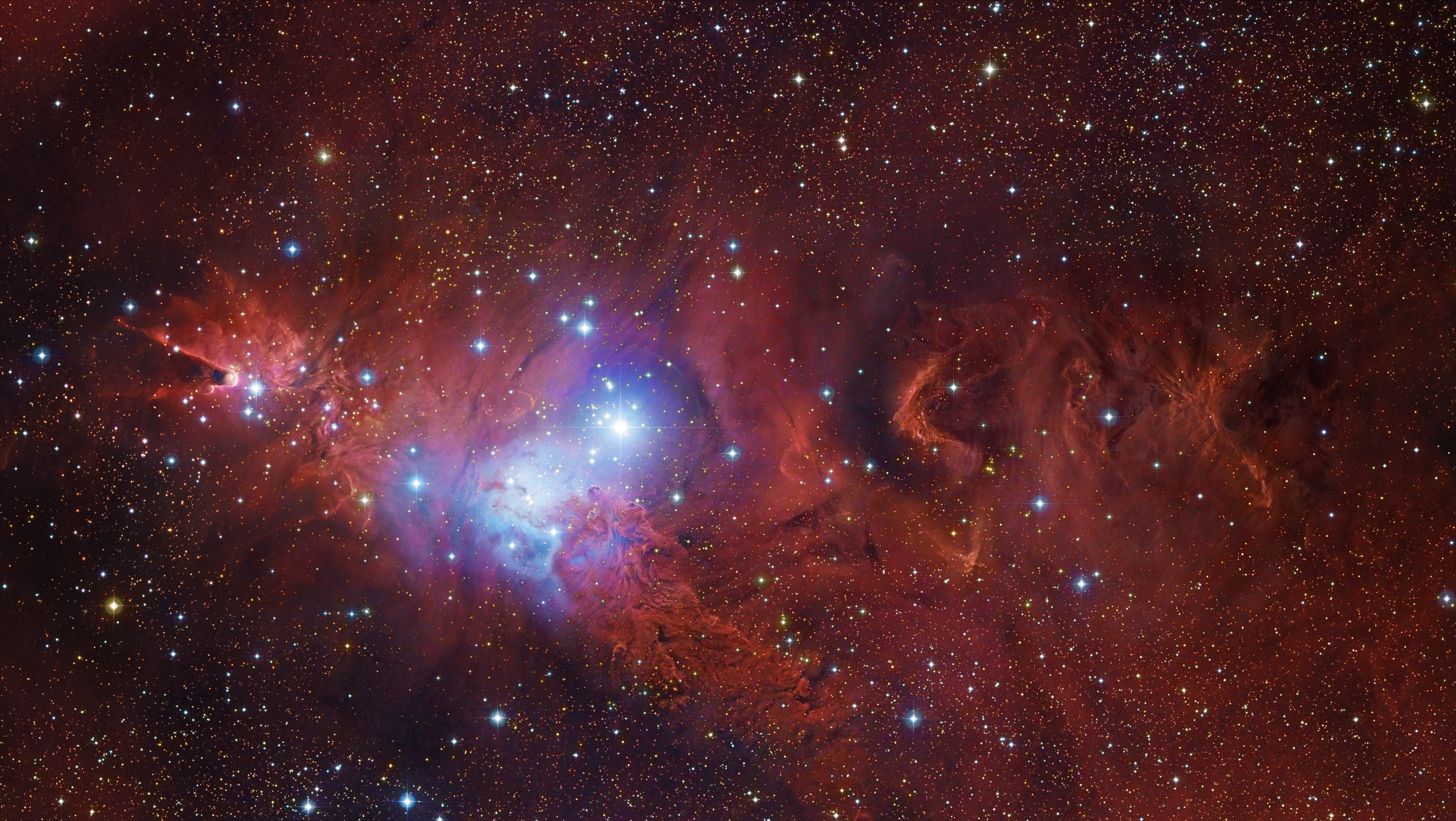 Strange shapes and textures can be found in neighborhood of the Cone Nebula. The unusual shapes originate from fine interstellar dust reacting in complex ways with the energetic light and hot gas being expelled by the young stars. The brightest star on the right of the above picture is S Mon, while the region just below it has been nicknamed the Fox Fur Nebula for its color and structure. The blue glow directly surrounding S Mon results from reflection, where neighboring dust reflects light from the bright star. The red glow that encompasses the whole region results not only from dust reflection but also emission from hydrogen gas ionized by starlight. S Mon is part of a young open cluster of stars named NGC 2264, located about 2500 light years away toward the constellation of the Unicorn (Monoceros). Even though it points right at S Mon, details of the origin of the mysterious geometric Cone Nebula, visible on the far left, remain a mystery.