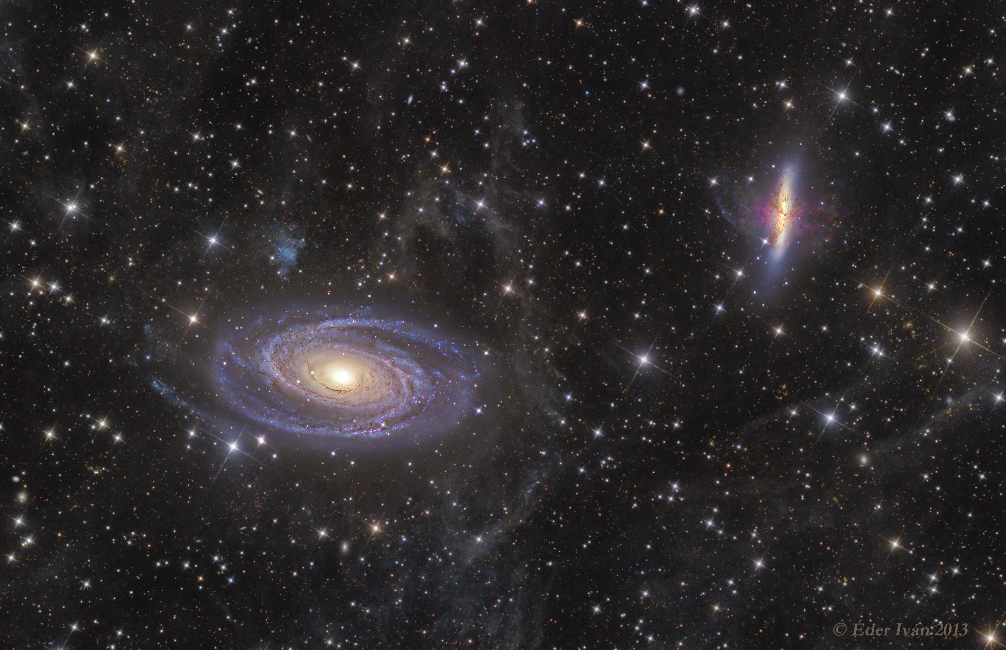 Aquí, en nuestra galaxia de la Vía Láctea, tenemos una excelente oportunidad para observar cómo M81 y M82 se enfrentan, a tan solo 12 millones de años luz de distancia. Enfrentadas en una lucha gravitacional durante aproximadamente mil millones de años, las dos galaxias brillantes se capturan en esta profunda imagen telescópica, construida a partir de 25 horas de datos de imagen. Su reciente encuentro cercano probablemente resultó en los brazos espirales acentuados de M81 (izquierda) y en regiones de formación estelar violentas en M82, tan energéticas que la galaxia emite radiación en rayos X. Después de múltiples pasadas, dentro de unos pocos miles de millones de años solo quedará una galaxia. Desde nuestra perspectiva, este momento cósmico se observa a través de una cortina delante de las estrellas y nubes de polvo de la Vía Láctea. Faintemente reflejando la luz de las estrellas del primer plano, las nubes de polvo son cirros galácticos o nebulosas de flujo integrado, relativamente poco exploradas, ubicadas a solo unos pocos cientos de años luz por encima del plano de la Vía Láctea.