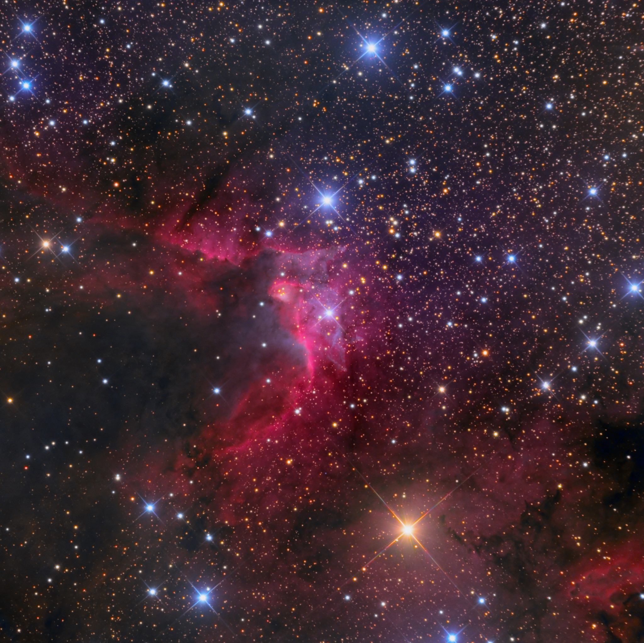 Esta escena colorida muestra el brillo polvoriento y rojizo de la región de emisión del catálogo Sharpless Sh2-155, la Nebulosa Cueva. A unos 2.400 años luz de distancia, esta región se encuentra en el plano de nuestra Galaxia Vía Láctea, en dirección a la constelación norteña real de Cefeo. Las exploraciones astronómicas de la región revelan que se formó en el límite de la nube molecular masiva de Cefeo B y las estrellas jóvenes y azules calientes de la asociación Cefeo OB 3. El borde brillante de gas hidrógeno ionizado está energizado por la radiación de las estrellas calientes, dominada por la brillante estrella azul de tipo O situada por encima del centro de la imagen. Frentes de ionización impulsados por la radiación probablemente están desencadenando colapsos de núcleos y la formación de nuevas estrellas dentro de la región. Apropiadamente dimensionada para ser un criadero estelar, la cueva cósmica tiene más de 10 años luz de ancho.