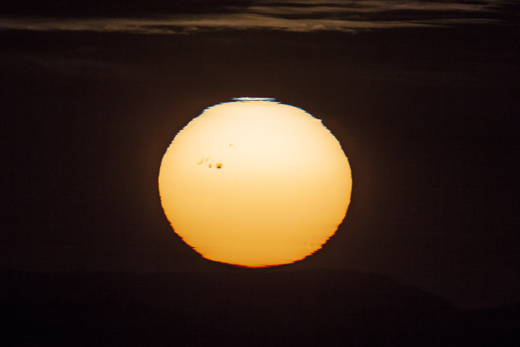 Sunsets may be the most watched celestial event, but lately sunsets have even offered something extra. A sunspot so large it was visible to the naked eye is captured in Swiss skies in this sunset scene from January 5, crossing left to right near the center of a solar disk dimmed and distorted by Earth's dense atmosphere. Detailed views reveal a large solar active region composed of sunspots, some larger than planet Earth itself. Cataloged as active region AR 1944, on January 7 it produced a substantial solar flare and a coronal mass ejection (CME) forecast to reach Earth. The CME could trigger geomagnetic storms and aurora on January 9.