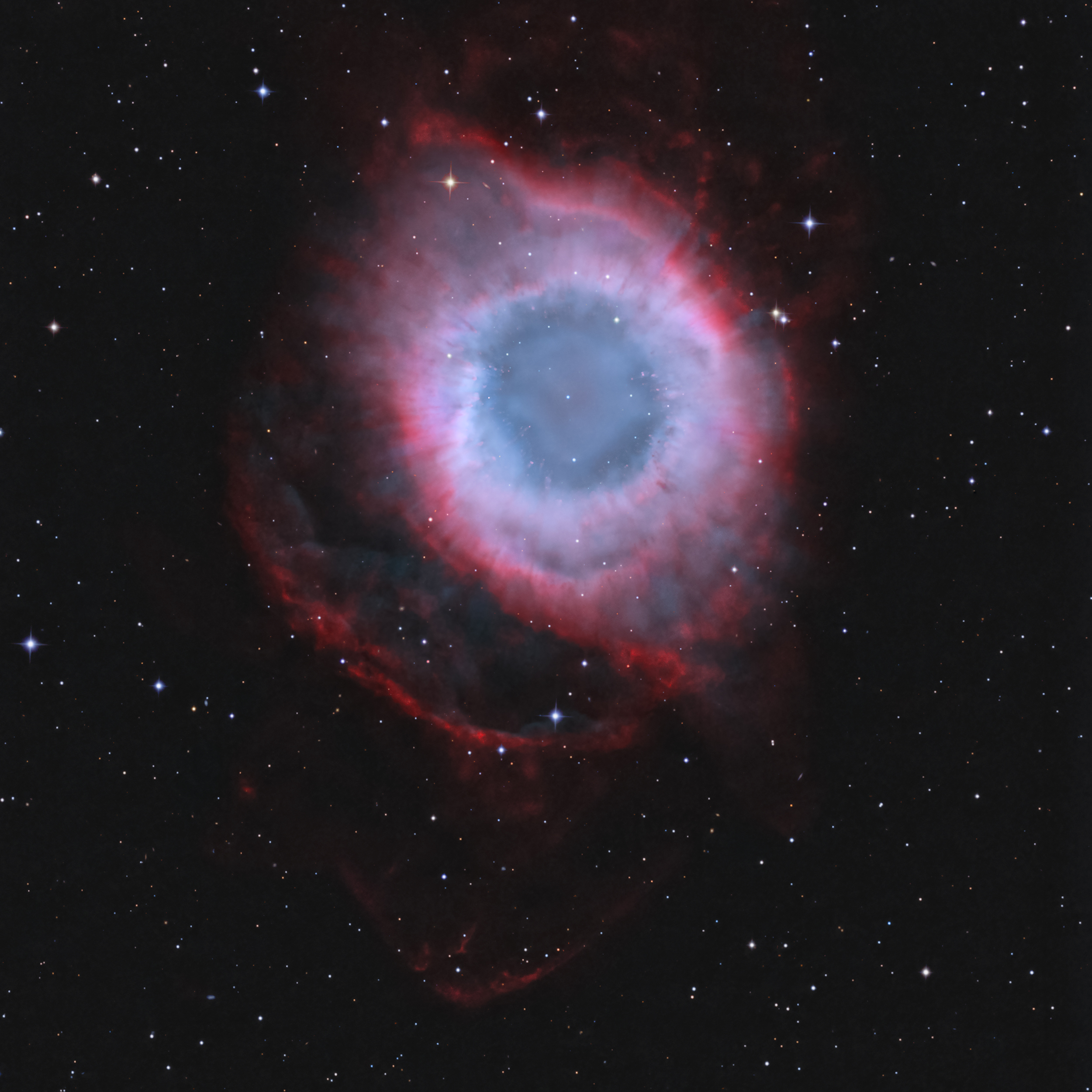A solo 700 años luz de la Tierra, en la constelación de Acuario, una estrella similar al Sol está muriendo. Sus últimos miles de años han producido la Nebulosa Helix (NGC 7293), un ejemplo bien estudiado y cercano de una nebulosa planetaria, típica de esta fase final de la evolución estelar. Un total de 28,5 horas de tiempo de exposición se han dedicado para crear esta visión profunda de la nebulosa. Combinando datos de imágenes de banda estrecha de las líneas de emisión de átomos de hidrógeno en tonos rojos y de átomos de oxígeno en tonos azul-verde, se muestran detalles notables de la región interior más brillante de la Helix, que tiene aproximadamente 3 años luz de diámetro, pero también se siguen características más tenues del halo exterior que le dan a la nebulosa un alcance de más de seis años luz. El punto blanco en el centro de la Helix es la estrella caliente central de esta nebulosa planetaria. A primera vista, la Helix parece una nebulosa sencilla, pero ahora se entiende que tiene una geometría sorprendentemente compleja.