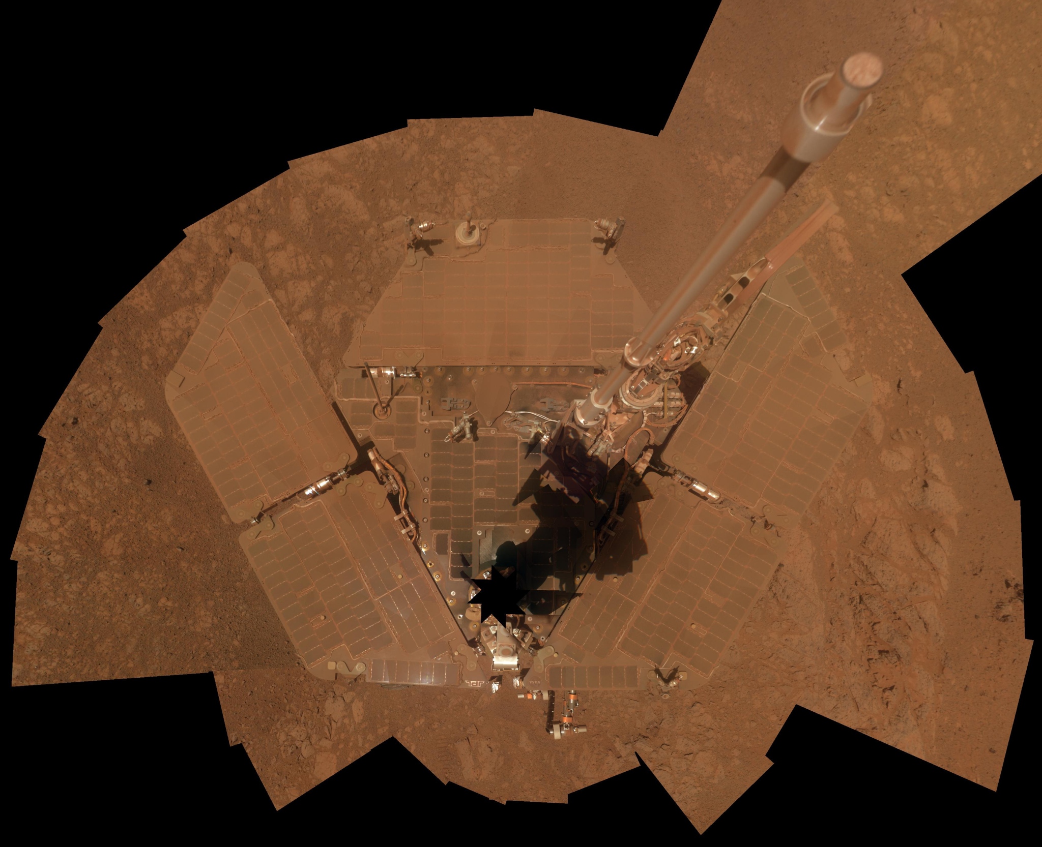 El 25 de enero de 2004 (UTC), el rover Opportunity aterrizó en Marte, lo que hace que hoy sea el décimo aniversario de su llegada. Después de más de 3.500 sols (días solares marcianos), el robot del tamaño de un carrito de golf proveniente de la Tierra sigue activamente explorando el Planeta Rojo, aunque su plan original de misión era de tres meses. Esta autoretrato fue realizado con la cámara panorámica de Opportunity hace poco tiempo. El mástil que sostiene la cámara ha sido eliminado de la imagen compuesta, pero su sombra es visible sobre las placas solares polvorientas distribuidas a lo largo del techo del rover. Para comparación, se muestra un autoretrato similar del fin de 2004 en el recuadro insertado. Habiendo recorrido aproximadamente 39 kilómetros (24 millas) desde su sitio de aterrizaje, Opportunity ahora se encuentra en el punto Solander en el borde del cráter Endeavour.