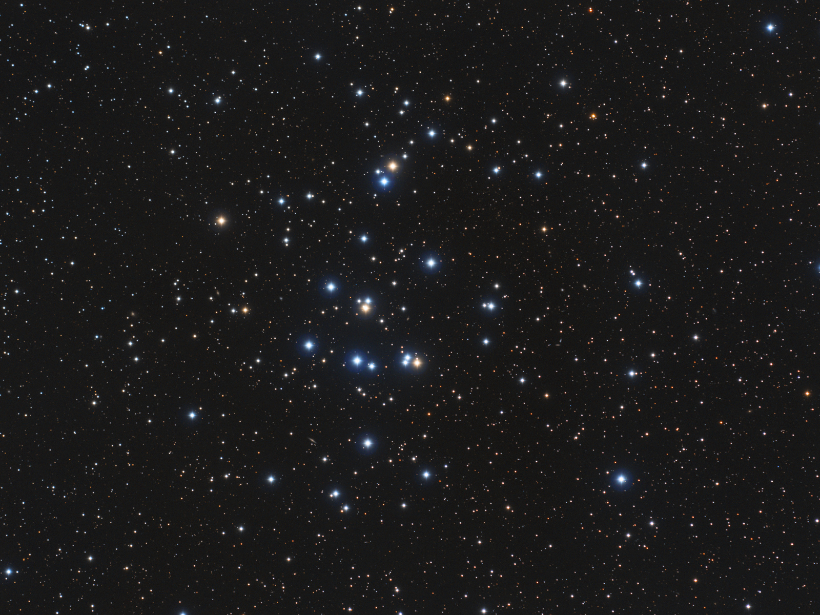 A tan solo 600 años luz de distancia, M44 es uno de los cúmulos estelares más cercanos a nuestro sistema solar. También conocido como Praesepe o el Cúmulo de las Abejas, sus estrellas son jóvenes, aproximadamente de 600 millones de años, en comparación con los 4.500 millones de años de la edad de nuestro Sol. Basándose en edades similares y en su movimiento a través del espacio, se cree que M44 y el aún más cercano cúmulo estelar Hyades en Tauro nacieron juntos en la misma gran nube molecular. Un cúmulo abierto que abarca unos 15 años luz, M44 contiene alrededor de 1,000 estrellas y ocupa aproximadamente tres veces el tamaño de la Luna llena (1.5 grados) en el cielo, dentro de la constelación de Cáncer. Visible a simple vista, M44 ha sido reconocido desde la antigüedad. Descrito como una nube tenue o niebla celeste mucho antes de ser incluido como la entrada número 44 en el catálogo del siglo XVIII de Charles Messier, el cúmulo no fue resuelto en sus estrellas individuales hasta que estuvieron disponibles los telescopios. Un objetivo popular para observadores modernos equipados con binóculos, las pocas gigantes rojas de tonalidad amarillenta del cúmulo están dispersas a través del campo de su más brillante secuencia principal de estrellas calientes de color azul en esta captura colorida de este grupo estelar.