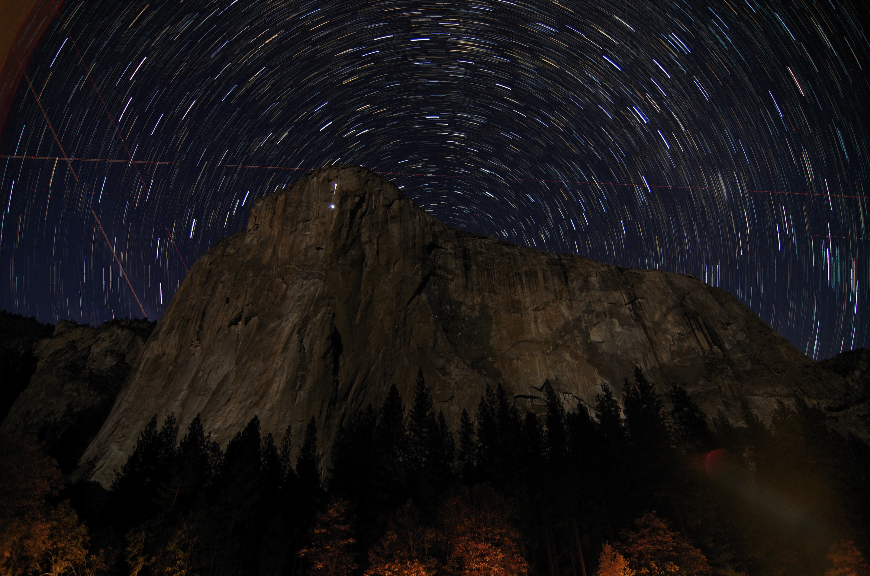 Towering 3,000 feet from base to summit, the famous granite face of El Capitan in Earth's Yosemite National Park just hides the planet's north celestial pole in this skyscape. Of course, the north celestial pole is at the center of all the star trails. Their short arcs reflecting the planet's daily rotation on its axis are traced in a digital stack of 36 sequential exposures. Linear trails of passing airplane navigation lights and a flare from car lights along the road below are also captured in the sequential stack. But the punctuated trail of light seen against the sheer El Capitan itself follows a climbing team on the night of November 8, 2013. The team is ascending toward the summit along The Nose, a historic rock climbing route.