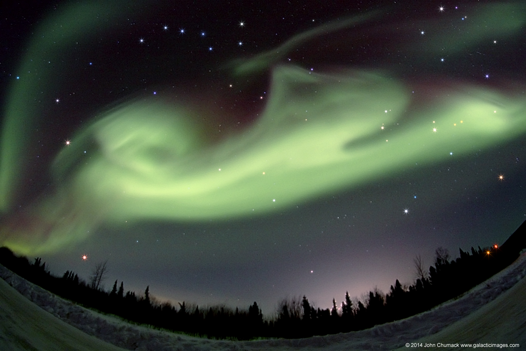 Sometimes it is hard to believe what you see in the sky. While leading his annual aurora tour last month near Fairbanks in central Alaska, astrophotographer John Chumack and his company saw a most unusual aurora. This bright aurora appeared to change into the shape of a jumping dog, complete with a curly tail. He was able to capture the fleeting natural apparition in the above image with a 15-second exposure through a wide-angle lens. By coincidence, he also captured a background sky filled with familiar highlights. Planets visible include bright Jupiter through the dog's front legs and reddish Mars below the dog's hind legs. Stars visible include the Big Dipper stars above the dog's midsection and reddish Betelgeuse shining on the far right. This dog would not be following him home, however, and within a few minutes morphed into other shapes before the geomagnetic storm particles that created it shifted to strike the Earth elsewhere.