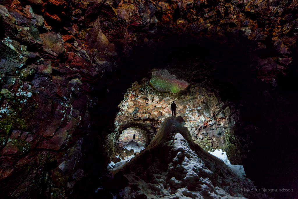 Yes, but have you ever seen aurora from a cave? To capture this fascinating juxtaposition between below and above, astrophotographer Bjargmundsson spent much of a night alone in the kilometer-long Raufarh�lshellir lava cave in Iceland during late March. There, he took separate images of three parts of the cave using a strobe for illumination. He also took a deep image of the sky to capture faint aurora, and digitally combined the four images later. The 4600-year old lava tube has several skylights under which stone rubble and snow have accumulated. Oh -- the person standing on each mound -- it's the artist.