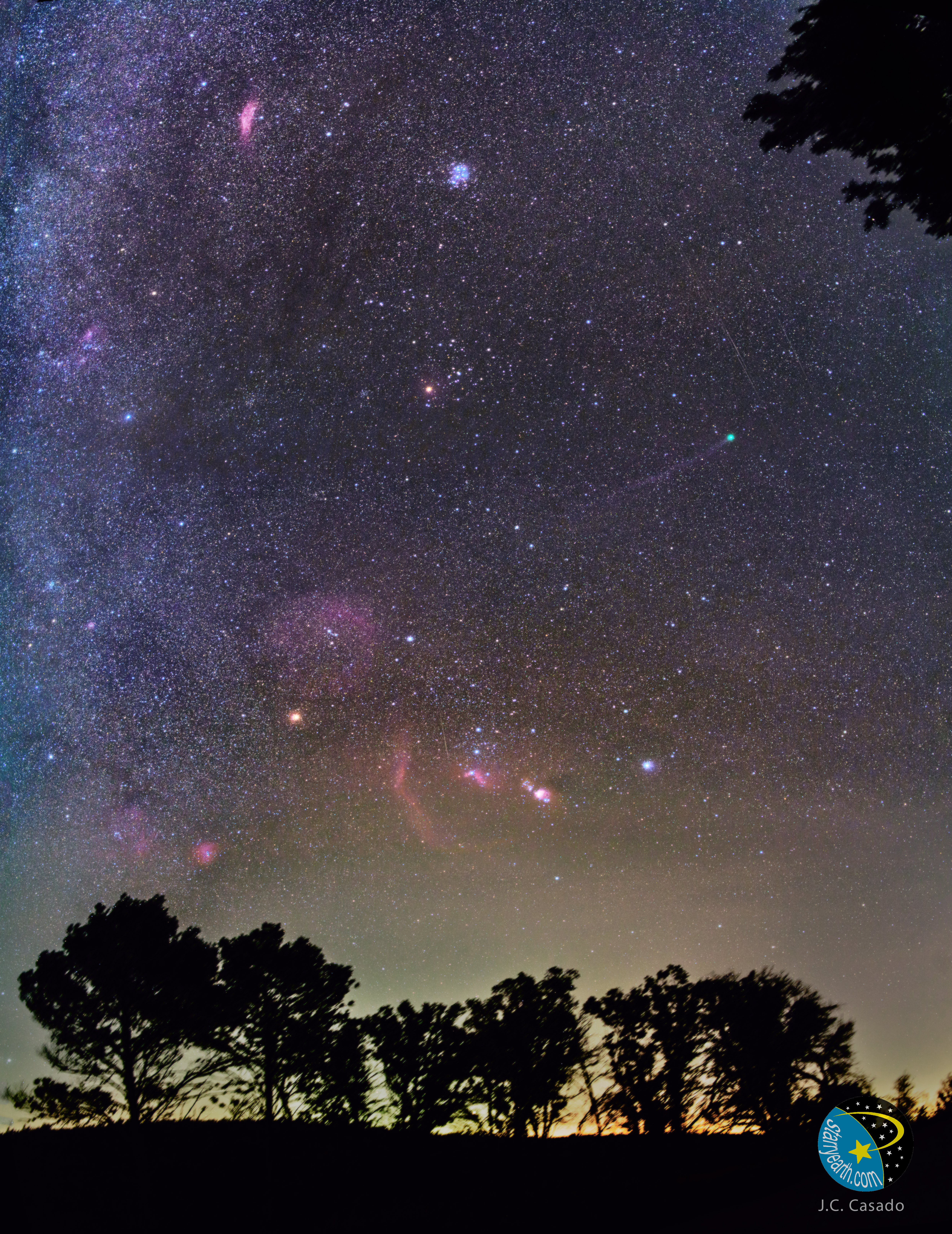¿Cuál de estos iconos del cielo nocturno puedes encontrar en esta hermosa y profunda exposición del cielo invernal del norte? Entre los elementos visibles se encuentran las estrellas de la cintura de Orión, la Nebulosa de Orión, el cúmulo estelar de las Pléyades, las brillantes estrellas Betelgeuse y Rigel, la Nebulosa de California, la Lazo de Barnard y el Cometa Lovejoy. Las estrellas de la cintura de Orión están casi verticales en la línea central entre el horizonte y el centro de la imagen, con la estrella más baja de la cintura oculta por la nebulosa roja de la Llama. A la izquierda de la cintura se encuentra el arco rojo de la Lazo de Barnard, seguido por la brillante estrella naranja Betelgeuse, mientras que a la derecha de la cintura se encuentra la nebulosa de Orión, seguida por la brillante estrella azul Rigel. El cúmulo de estrellas azules brillantes cerca del centro superior es las Pléyades, y a su izquierda se encuentra la nebulosa roja de California. La brillante estrella naranja por encima del centro de la imagen es la estrella Aldebarán, mientras que el objeto verde con una larga cola a su derecha es el Cometa C/2014 Q2 (Lovejoy). La imagen destacada fue tomada hace aproximadamente dos semanas cerca del pueblo de Palau en España.