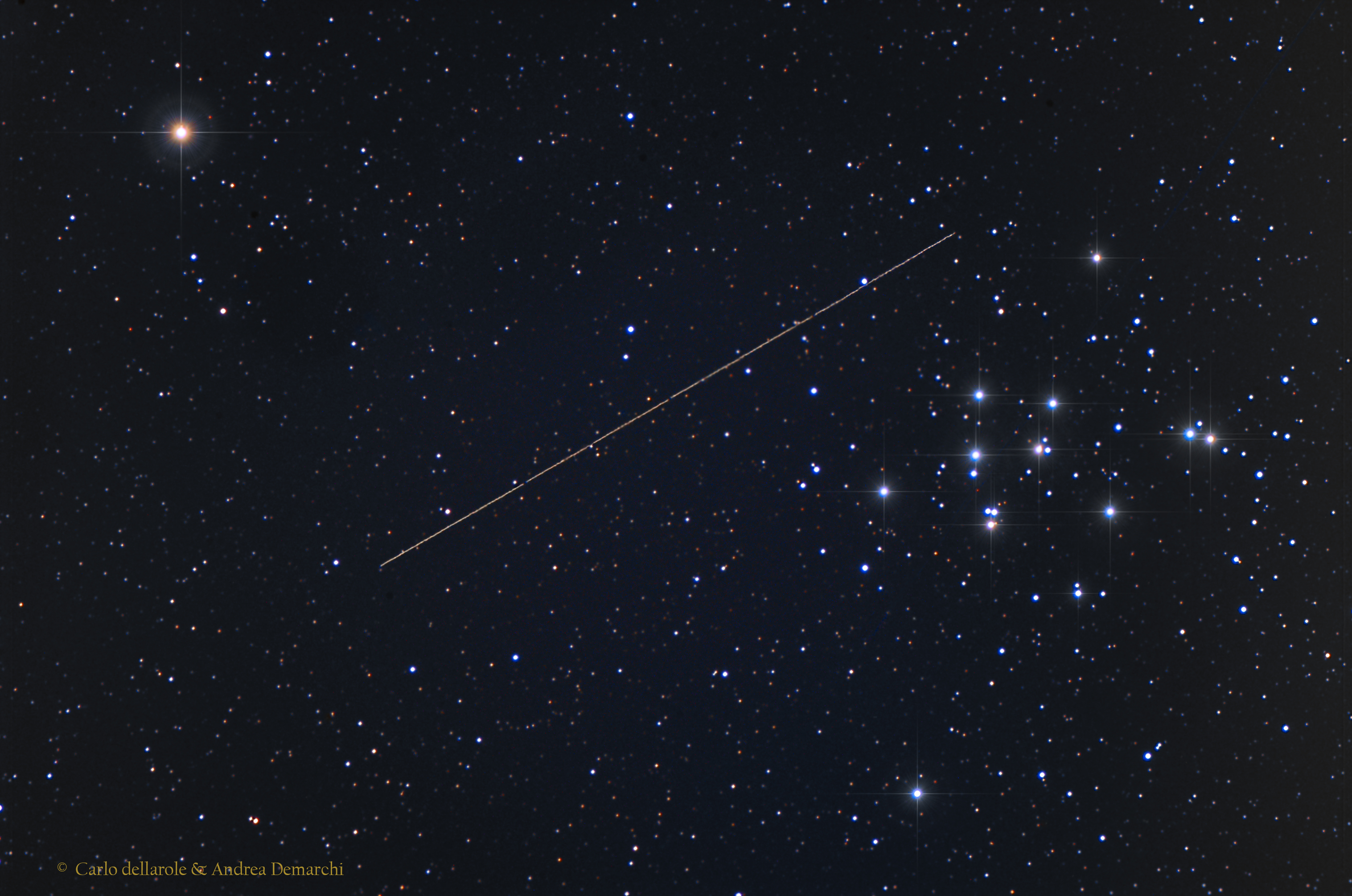 El lunes 26 de enero, el asteroide bien rastreado 2004 BL86 realizó su acercamiento más cercano, a tan solo 1.2 millones de kilómetros de nuestro planeta. Eso equivale aproximadamente a 3.1 veces la distancia Tierra-Luna o a 4 segundos-luz. Moviéndose rápidamente a través del cielo nocturno terrestre, dejó esta estela en una exposición de 40 minutos realizada el 27 de enero desde Piemonte, Italia. El campo de visión telescópico, notablemente hermoso, incluye a M44, también conocido como el cúmulo estelar de la Colmena o Praesepe en el signo de Cáncer. Por supuesto, su encuentro cercano con M44 es solo aparente, ya que el cúmulo estelar se encuentra casi en la misma línea de visión hacia el asteroide cercano a la Tierra. La distancia real entre el cúmulo estelar y el asteroide es de aproximadamente 600 años-luz. Sin embargo, el acercamiento cercano a la Tierra permitió imágenes detalladas mediante radar desde la antena de la Red de Espacio Profundo de NASA en Goldstone, California, y reveló que el asteroide tiene su propia luna.