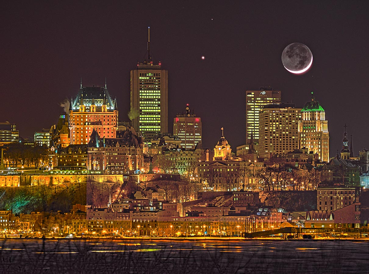 Tomada el 20 de febrero, cinco exposiciones diferentes realizadas en rápida sucesión se utilizaron para crear esta atractiva imagen en teleobjetivo. En combinación, revelan un amplio rango de brillo visible a simple vista en esa fría noche, desde el resplandor urbano del horizonte de la ciudad de Quebec hasta la triple conjunción de Luna, Venus y Marte. Poco después del atardecer, la joven Luna muestra su brillante creciente junto a resplandeciente Venus. Marte, más tenue, se encuentra cerca de la parte superior del encuadre. Aunque los detalles en la parte iluminada de la Luna se ven borrosos, las características en la parte oscura y sombreada del disco lunar son notablemente claras. Aún sin luces de la ciudad, la noche lunar está iluminada únicamente por la luz terrestre, luz reflejada desde el lado iluminado del planeta Tierra.