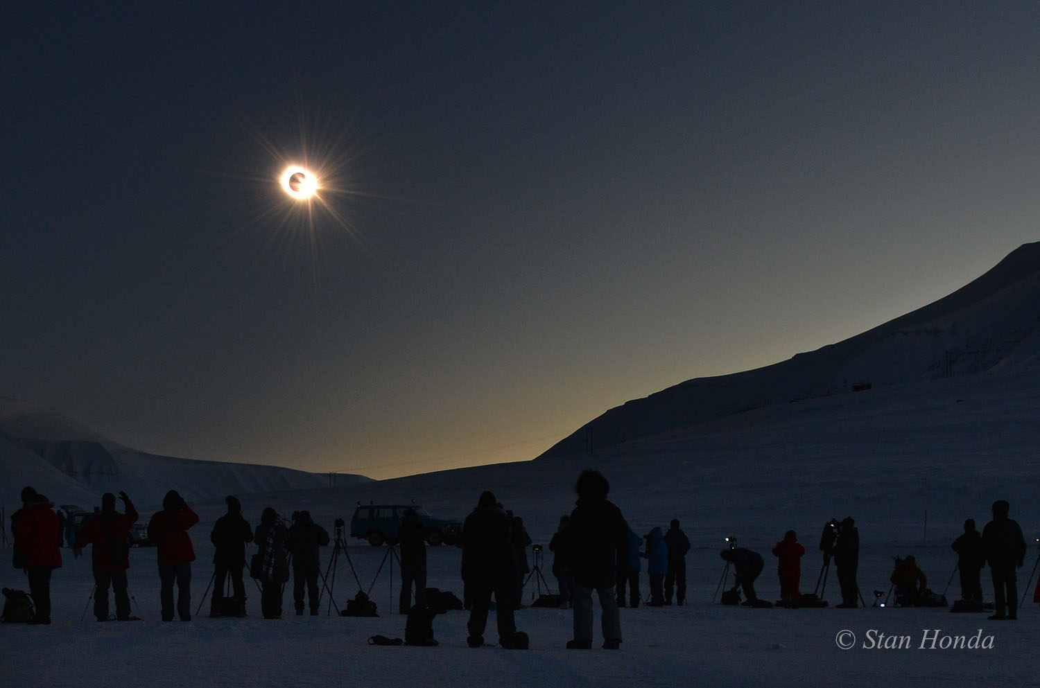 Snowy and cold is weather you might expect at the start of spring for Longyearbyen on the Arctic archipelago of Svalbard, Norway. But that turned out to be good weather for watching the Moon's umbral shadow race across northern planet Earth. The region was plunged into darkness for 3 minutes during the March 20 total solar eclipse while insulated eclipse chasers witnessed the dark Sun in the cold clear sky. In this well-timed snapshot captured near the end of totality, the Moon's shadow sweeps away from the horizon and the solar corona fades as the lunar disk just begins to uncover the Sun. Streaming past the Moon's edge, direct rays of sunlight create the fleeting appearance of a glistening diamond ring. Gallery: Solar Eclipse