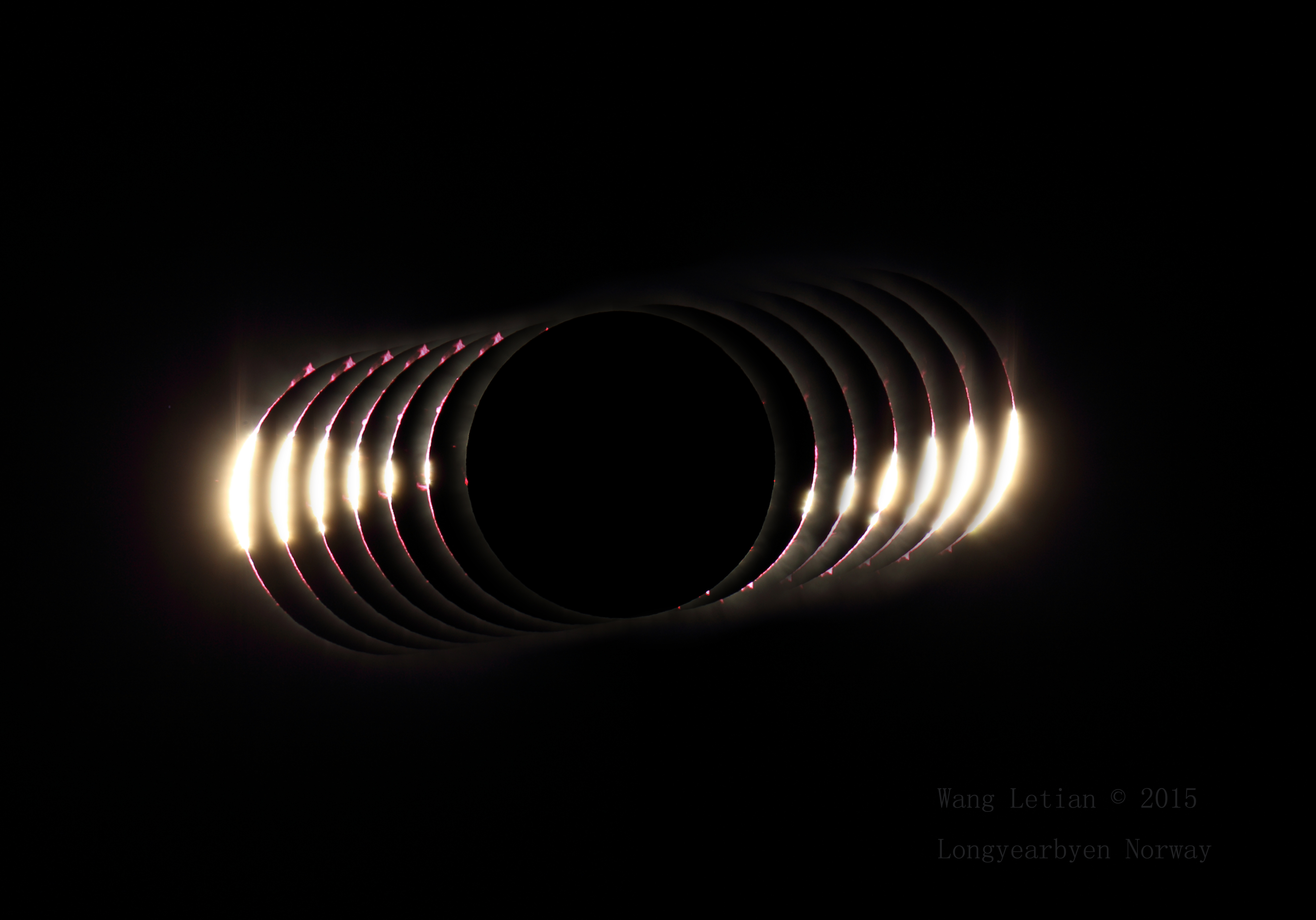 Cerca del equinoccio de marzo, el cielo frío y despejado sobre Longyearbyen, Noruega, la Tierra mostró un espectáculo atractivo: un eclipse total de Sol. La silueta de la Luna Nueva en los momentos justo antes y después de la fase total de tres minutos parece brotar de brillantes diamantes y perlas luminosas en esta composición de imágenes en tiempo real del evento celeste geocéntrico. La última y primera visión del disco solar, con el borde lunar rodeado por el resplandor de la corona interior del Sol, da la impresión de un anillo de diamantes en el cielo. En los límites de la totalidad, la luz solar que atraviesa las valles en el terreno irregular alrededor del borde de la Luna produce un efecto conocido como perlas de Baily, denominado así por el astrónomo inglés Francis Baily, quien promovió una explicación del fenómeno en 1836. Esta composición nítida también muestra la amplia gama de prominencias solares de color rosado que se elevan por encima del borde del Sol eclipsado.
