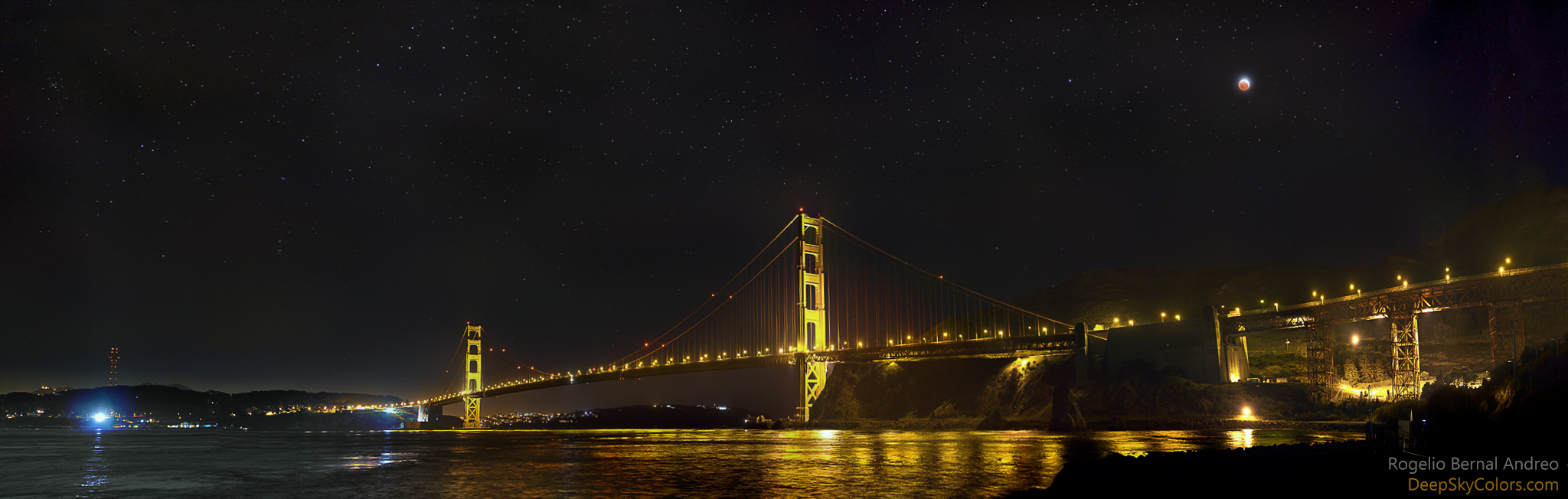 Las sombras se reflejan en el agua y en el cielo en esta vista panorámica del eclipse lunar total del 4 de abril sobre el Puente Golden Gate de San Francisco. Justo dentro de la sombra de la Tierra, el disco de la Luna llena aún es fácil de ver en su breve fase total. El paisaje nocturno urbano fue compuesto para cubrir el amplio rango de brillo visible al ojo humano. Este fue el eclipse lunar total más corto del siglo, y también fue el tercero de una serie de cuatro eclipses lunares totales consecutivos, una serie conocida como tetrad. Aproximadamente cada seis meses, los dos anteriores tuvieron lugar el 15 de abril y el 8 de octubre del año anterior. El próximo y último eclipse de la tetrad tendrá lugar el 28 de septiembre. Esta tetrad de 2014-2015 es una de las ocho series de eclipses lunares totales en el siglo XXI.