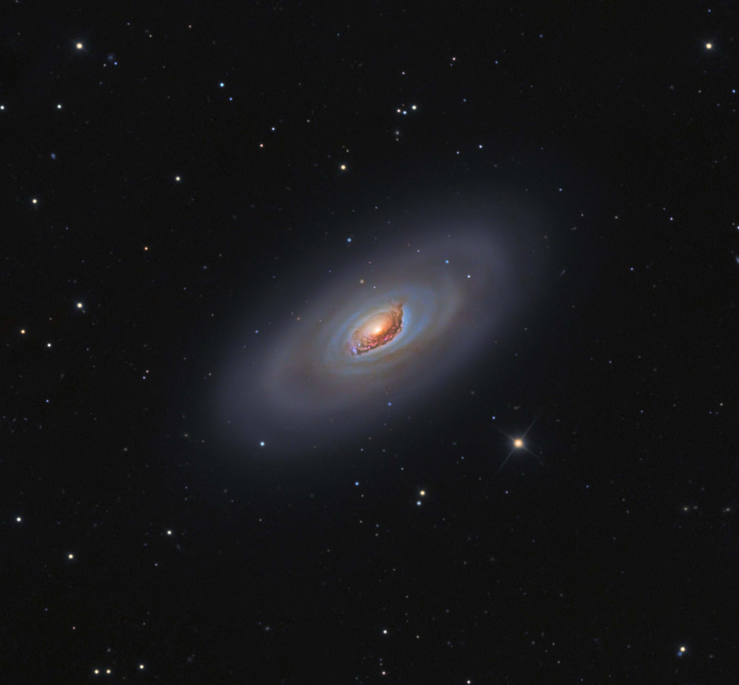 Esta gran, brillante y bella galaxia espiral es la Messier 64, a menudo llamada Galaxia Ojo Negro o Galaxia Bella Durmiente por su apariencia de párpados pesados en vistas telescópicas. M64 se encuentra a unos 17 millones de años luz de distancia en la constelación norteña bien ordenada de Coma Berenices. De hecho, la Galaxia Ojo Rojo también podría ser un apelativo adecuado en esta composición colorida. Las enormes nubes de polvo que ocultan la cara cercana de la región central de M64 están teñidas del característico brillo rojizo del hidrógeno asociado a regiones de formación estelar. Pero no son la única característica peculiar de esta galaxia. Las observaciones muestran que M64 está compuesta en realidad por dos sistemas concéntricos que rotan en direcciones opuestas. Mientras que todas las estrellas en M64 rotan en la misma dirección que el gas interestelar en la región central de la galaxia, el gas en las regiones externas, que se extiende hasta unos 40,000 años luz, rota en dirección opuesta. El ojo polvoriento y la rotación extraña son probablemente el resultado de una fusión de dos galaxias diferentes que ocurrió hace mil millones de años.