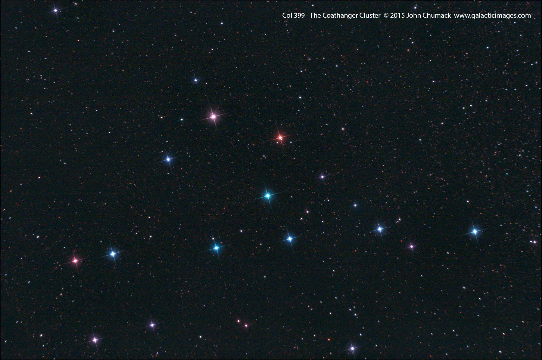 ¿Es este perchero un cúmulo estelar o un asterismo? Este enigma cósmico ha sido objeto de debate durante gran parte del siglo pasado, ya que los astrónomos se preguntaban si este objeto visible a simple vista con binóculos es realmente un cúmulo abierto físicamente asociado o simplemente una proyección casual. Las proyecciones estelares casuales se conocen como asterismos, un ejemplo de los cuales es el popular Cucharón. Recientes mediciones precisas desde diferentes puntos de vista en la órbita terrestre alrededor del Sol han revelado desviaciones angulares discordantes que indican que el Perchero se describe mejor como un asterismo. Conocido formalmente como Collinder 399, este agrupamiento estelar brillante es más ancho que la luna llena y se encuentra en la constelación del Zorro (Vulpecula).
