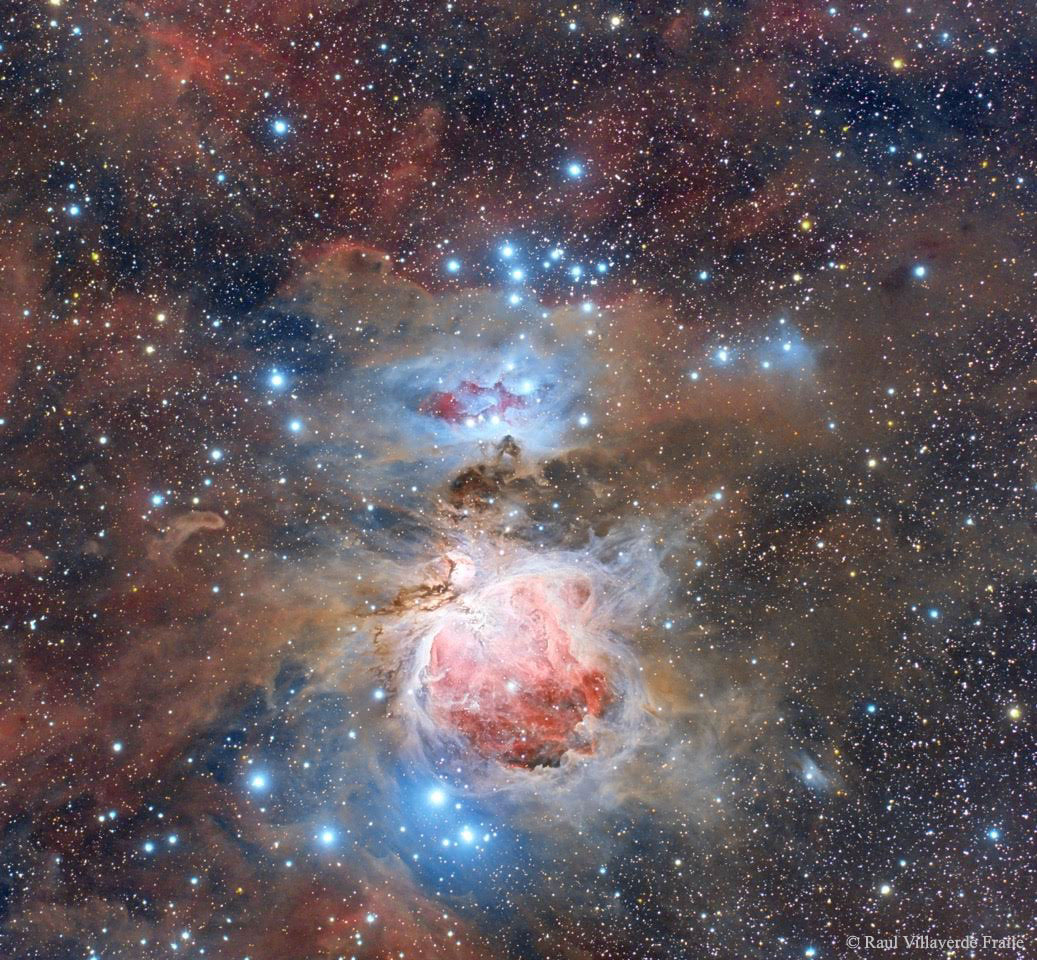 ¿Qué rodea un lugar activo de formación estelar? En el caso de la Nebulosa de Orión, el polvo. Todo el campo de Orión, ubicado a unos 1600 años luz de distancia, está inundado de filamentos intrincados y pictóricos de polvo. Opaco para la luz visible, el polvo se forma en la atmósfera exterior de estrellas frías masivas y es expulsado por un fuerte viento exterior de partículas. El Trapecio y otros cúmulos estelares en formación están incrustados en la nebulosa. Los intrincados filamentos de polvo que rodean M42 y M43 aparecen en color marrón en la imagen destacada, mientras que el gas brillante central se resalta en rojo. Durante los próximos millones de años, gran parte del polvo de Orión será lentamente destruido por las mismas estrellas que ahora se forman, o dispersado dentro de la Galaxia.