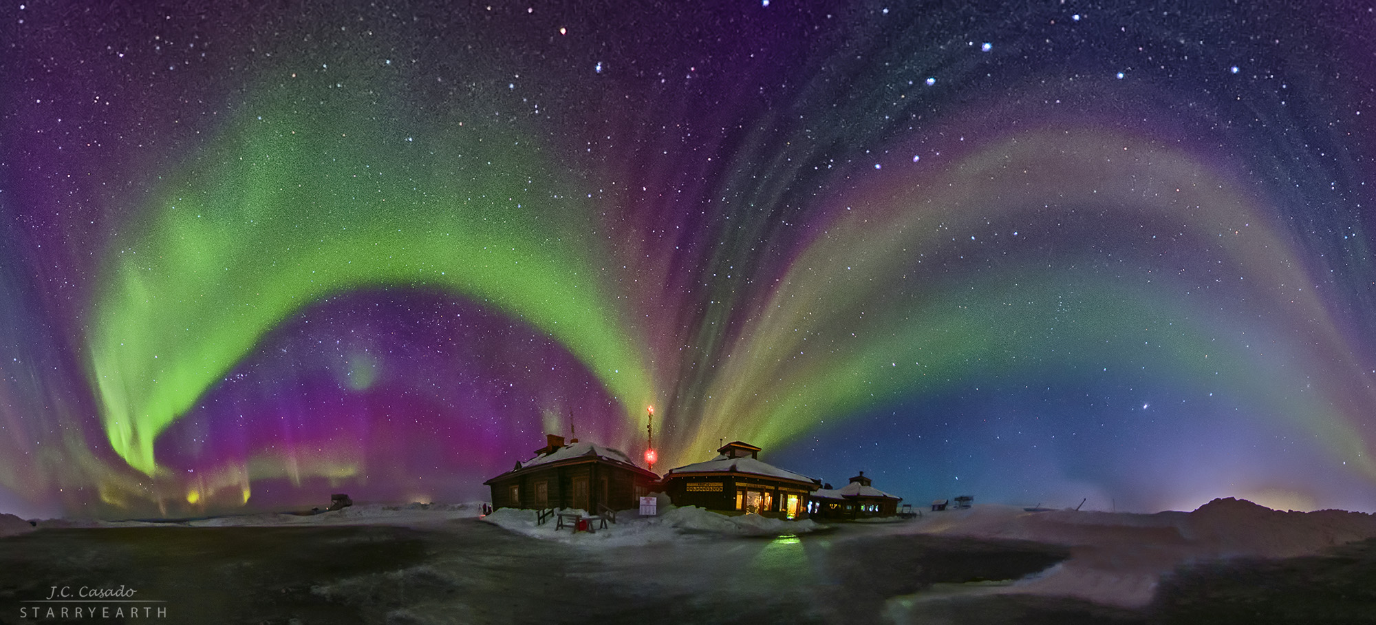 La primavera en el hemisferio norte es una buena temporada para los cazadores de auroras. Cerca de un equinoccio, el campo magnético terrestre está orientado para favorecer las interacciones con el viento solar que provocan el atractivo brillo de las auroras boreales. El 28/29 de marzo, los cielos sobre la colina de Kaunispää, en Laplandia, Finlandia, no decepcionaron. Las amplias cortinas aurorales de esa noche se capturan en esta impresionante vista panorámica que abarca un total de 360 grados. Los observadores locales quedaron maravillados por las brillantes exhibiciones que duraron durante toda la oscuridad, titilando con colores fácilmente visibles a simple vista.