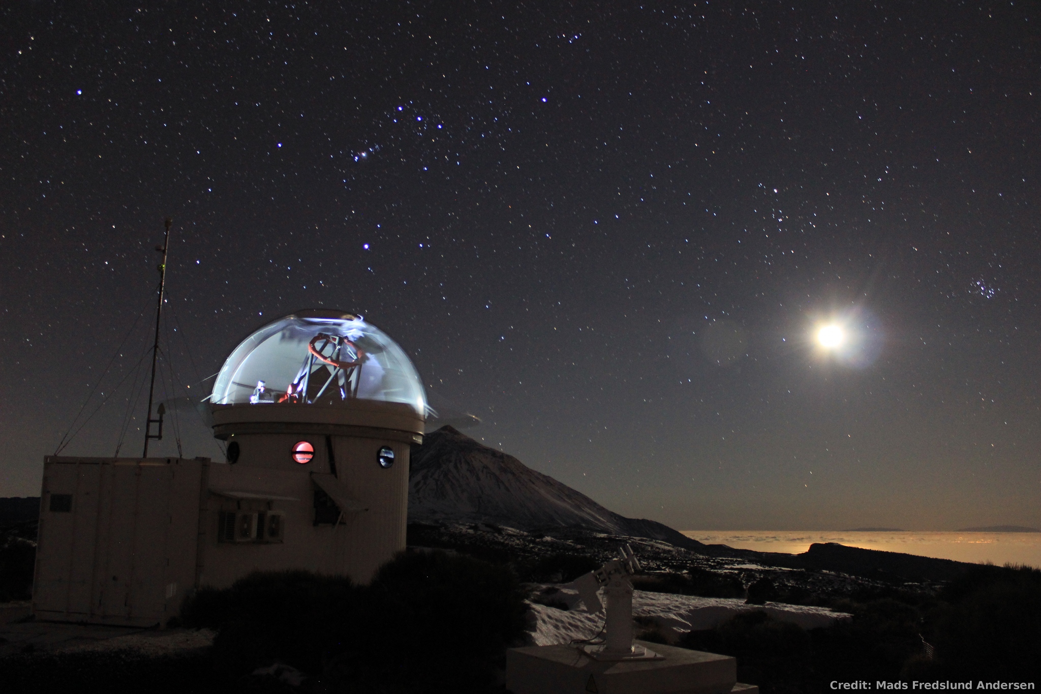 Cerca del cuarto creciente, la Luna en marzo ilumina este paisaje nevado y accidentado, una vista desde la cima de Tenerife hacia La Palma en el archipiélago canario. El gran volcán Teide, el punto más alto de España, se alza sobre el horizonte. Por encima brillan las conocidas estrellas brillantes de Orión, el Cazador. Añadiendo un toque onírico a la escena se encuentra el prototipo de telescopio de 1 metro de diámetro del proyecto de red global llamado Stellar Observations Network Group o SONG. La observación completamente robótica de SONG fue capturada durante la exposición de 30 segundos mientras el domo de la observación, con la rendija abierta, se rotaba a través del campo visual.